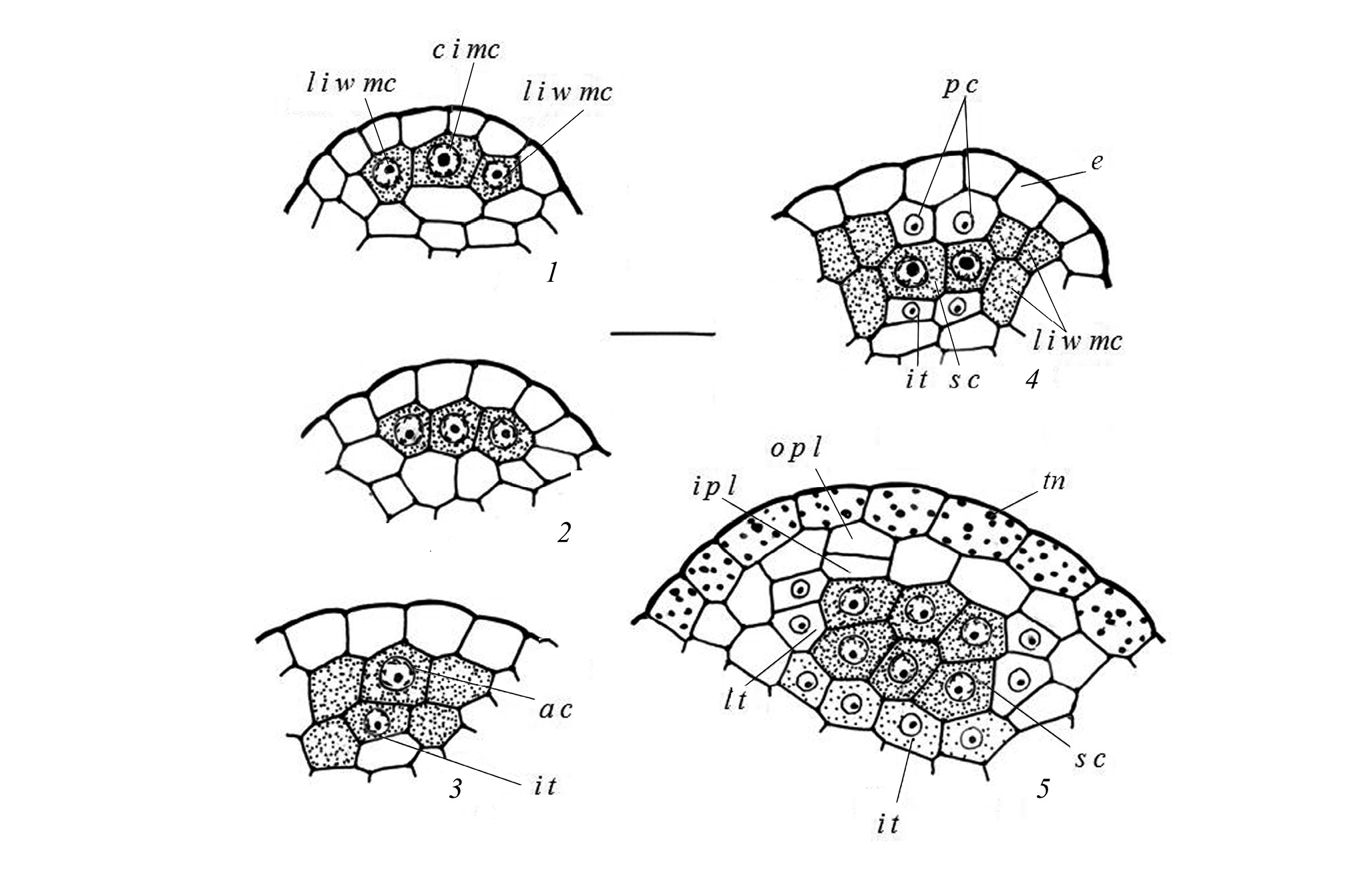 1–3 – бугорок пыльника, деления инициалей микроспорангия, формирование клеток внутреннего тапетума, археспория и инициалей латеральных частей стенки; 4 –периклинальные деления археспориальных клеток на спорогенные (внутрь) и париетальные (наружу) клетки; 5 – образование слоя тапетума с внутренней и латеральной сторон и начало делений клеток париетального слоя на наружный и внутренний слои, начало отложения танинов в эпидерме; a c – археспориальная клетка, c i mc – центральная инициаль микроспорангия, e – эпидерма, i p l – внутренний париетальный слой, i t – внутренний тапетум, l i w mc – инициали латеральной части стенки микроспорангия, l t – латеральный тапетум, o p l – наружный париетальный слой, o t – наружный тапетум, p c – париетальная клетка, s c – спорогенная клетка, tn – танины. Масштабная линейка, мкм: 5.