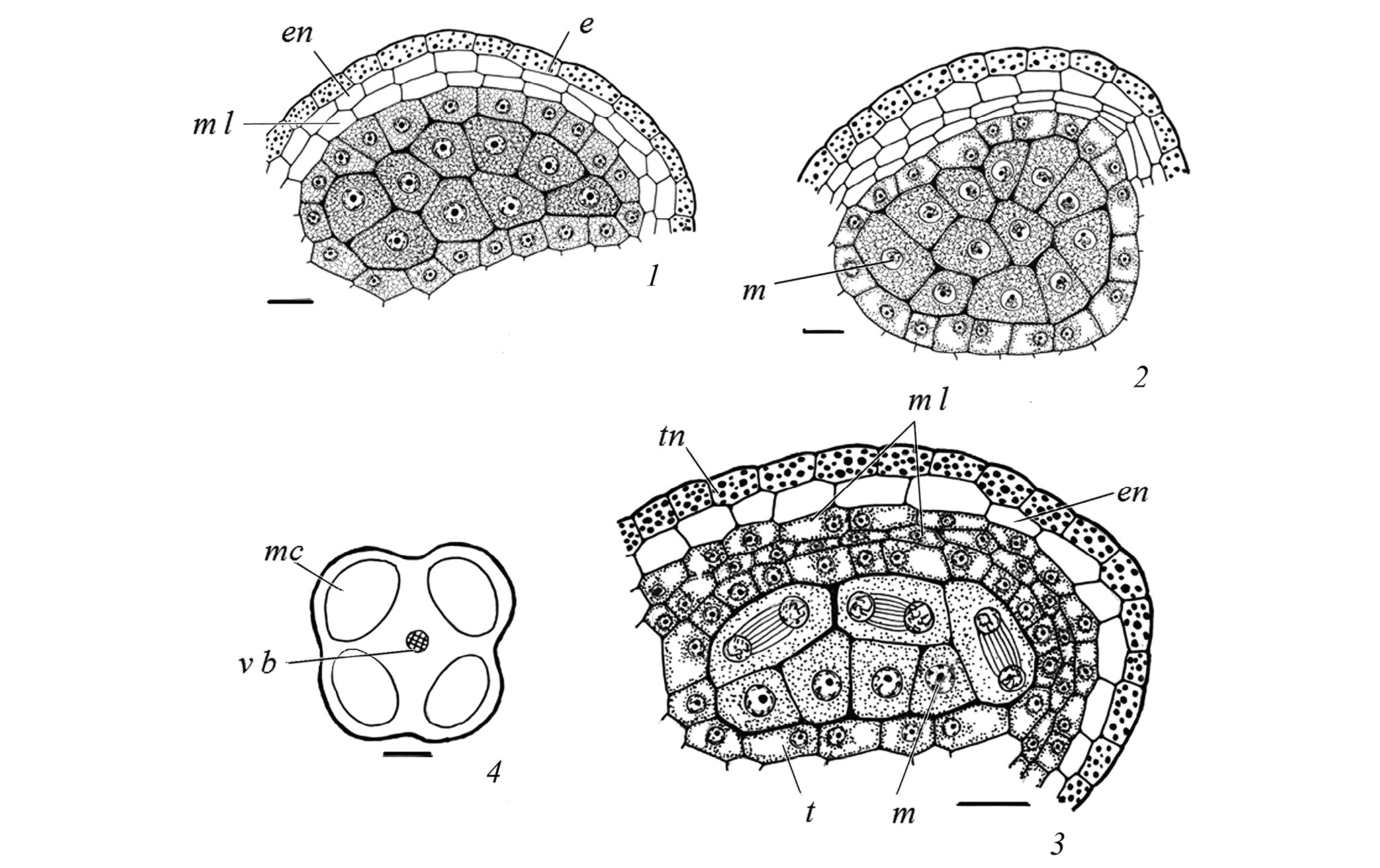 1 – стенка микроспорангия перед мейозом; 2 – стенка микроспорангия во время профазы I мейоза, образование двух средних слоев; 3, 4 – стенка микроспорангия на стадии образования диад ядер (3) и схема пыльника в средней части (4), в клетках эпидермы накапливаются танины; e – эпидерма, en – эндотеций, m – микроспороцит, mc –микроспорангий, m l – средний слой, t – тапетум, tn – танины, v b – проводящий пучок. Масштабная линейка, мкм: 1–3 – 5; 4 – 100.