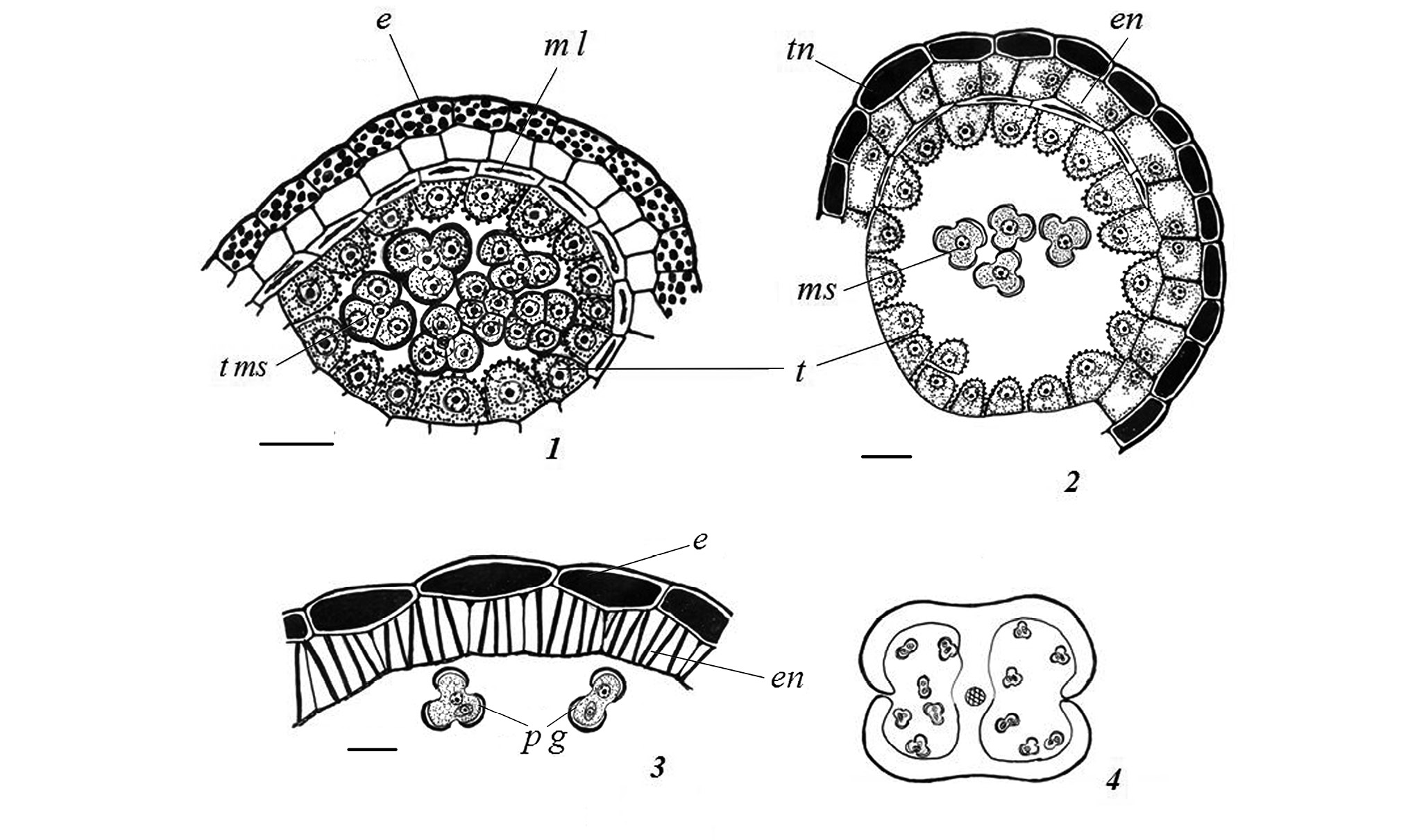 1 – стенка микроспорангия во время формирования тетрад микроспор, начало дегенерации клеток среднего слоя, произошло разрушение стенок между клетками тапетума, на внутренней тапетальной мембране видны орбикулы; 2 – стенка микроспорангия на стадии одиночных микроспор, клетки среднего слоя почти разрушились, радиальные стенки клеток эндотеция утолщены, в тапетуме увеличиваются размеры протопластов, а сами клетки становятся сильно вакуолизированными; 3, 4 – стенка микроспорангия в месте стомиума, в области вскрывания клетки плотно сомкнуты, отложение танинов в клетках эпидермы (3) и схема пыльника в средней части (4); e – эпидерма, en – эндотеций, m l – средний слой, ms – микроспора, p g – пыльцевое зерно, t – тапетум, t ms – тетрада микроспор, tn – танины. Масштабная линейка, мкм: 1–3 – 10; 4 – 20.
