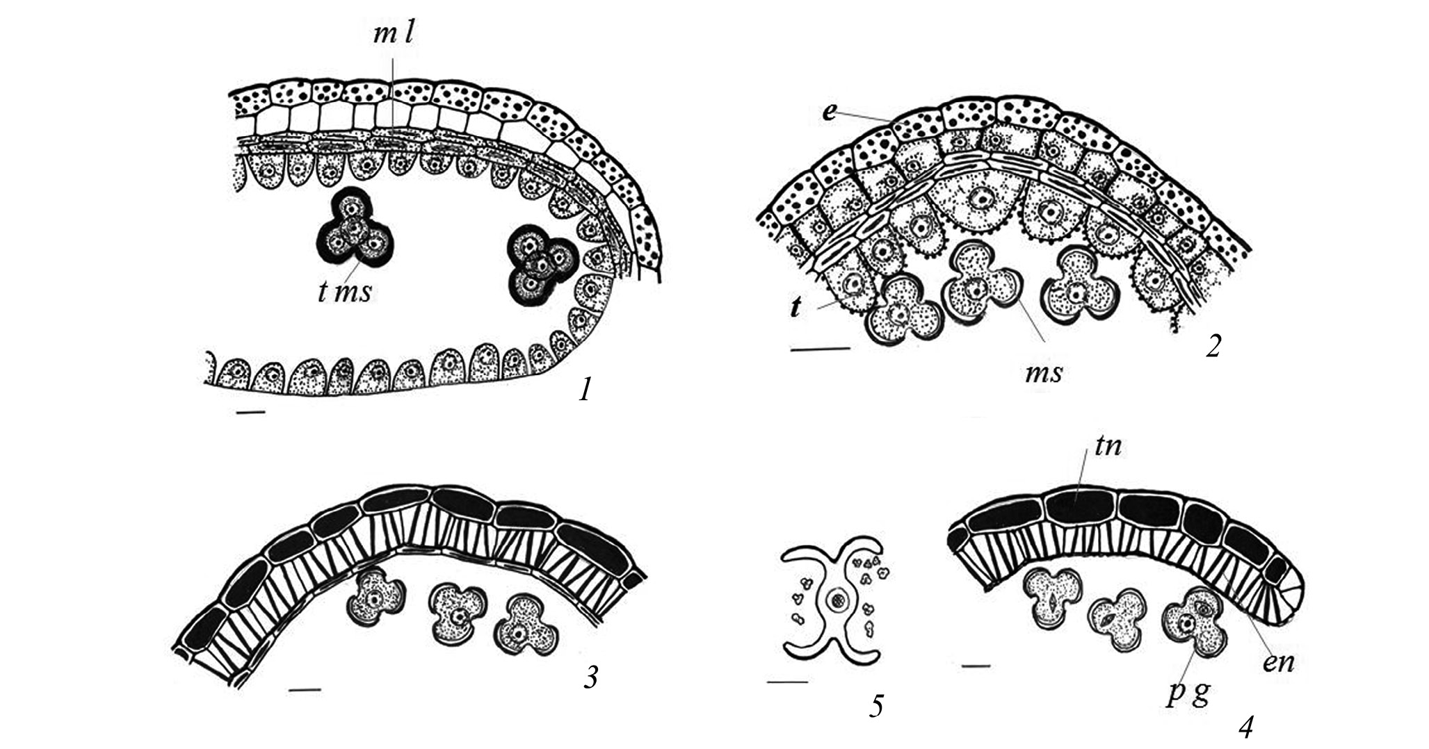 1 – стенка микроспорангия во время формирования тетрад микроспор, начало дегенерации клеток наружного среднего слоя, произошло разрушение стенок между клетками тапетума, на внутренней тапетальной мембране видны орбикулы; 2 – стенка микроспорангия на стадии ранних одиночных микроспор, клетки внутреннего среднего слоя начинают разрушаться, радиальные стенки клеток эндотеция утолщены, в тапетуме увеличиваются размеры протопластов, а сами клетки становятся сильно вакуолизированными; 3 – стенка микроспорангия на стадии поздних одиночных микроспор, видны остатки клеток тапетума, произошло разрушение септ в теках, в области стомиума клетки плотно сомкнуты; 4 – стенка микроспорангия перед вскрыванием пыльника, происходят деления в микроспорах и образуются 2-клеточные пыльцевые зерна; 5 – схема вскрывшегося пыльника в средней части. На всех стадиях развития наблюдается отложение танинов в клетках эпидермы; e – эпидерма, en – эндотеций, m l – средний слой, ms – микроспора, p g – пыльцевое зерно, t – тапетум, t ms – тетрада микроспор, tn – танины. Масштабная линейка, мкм: 1–3 – 10; 4 – 20; 5 – 100.
