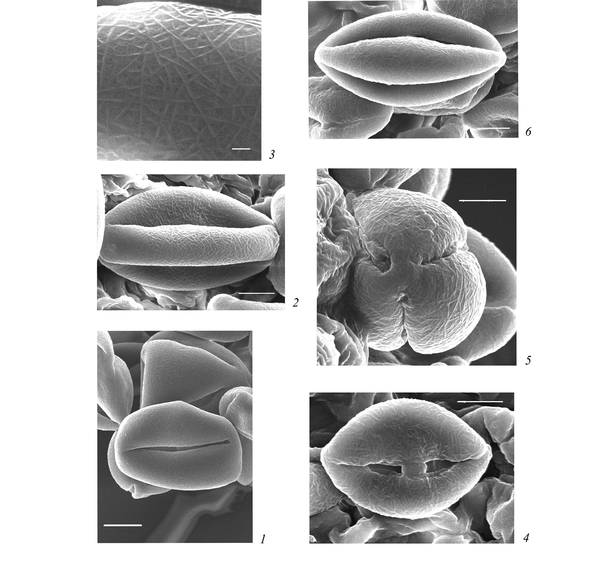 1, 4– equatorial view of pollen grain; 2, 5, 6 – general view of the pollen grains, apertures are visible; 3 – surface of pollen grain. Scale bars, µm: 1 – 10; 2, 4–6 – 5; 3 – 1.