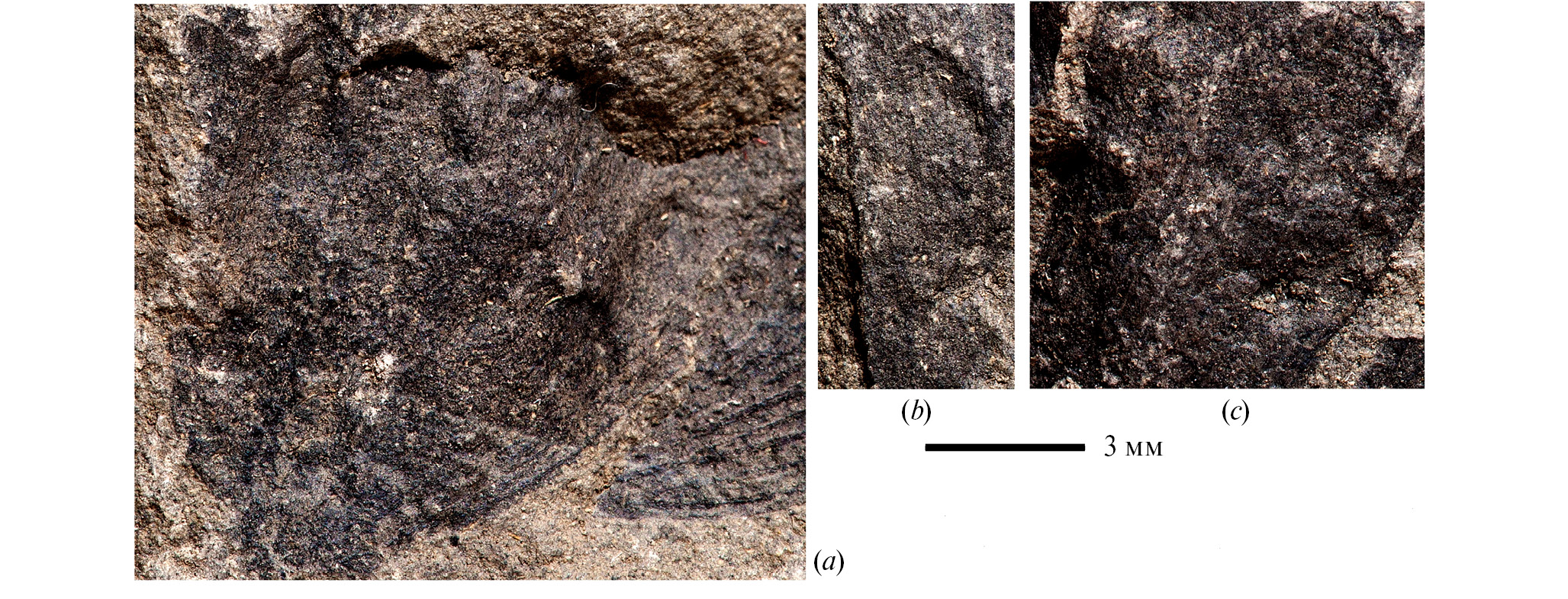 Рис. 1. Фрагмент вайи Schvedovia radczenkovii, общий вид: а – основание анабазального сегмента; видны вместилища (спорангии?) с несколькими спорами (?); b, с – средние части анабазальных сегментов; видны овальные вместилища (спорангии?) с несколькими округлыми спорами (?).