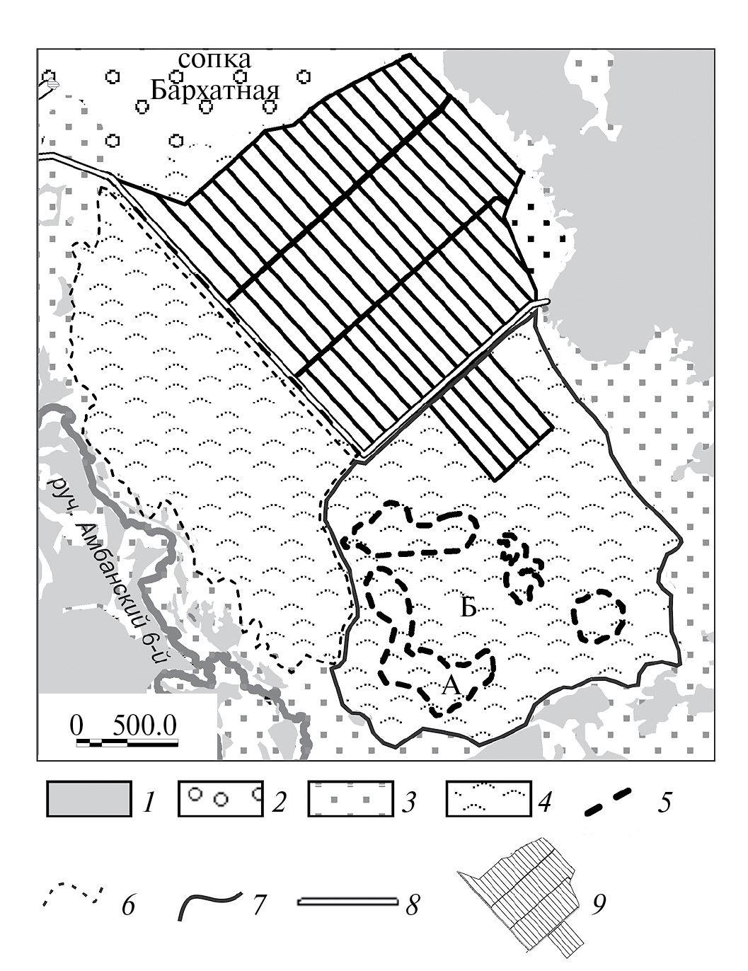 Fig. 1. Schematic map of the study area: А – the bog site unburned in 2008; Б – the site burned in 2008; 1 – secondary birch-aspen forest; 2 – Siberian pine-broadleaved forest; 3 – sedge-reedgrass swampy meadowes with meadowsweet; 4 – mesotrophic dwarf-shrub-sphagnum bog with larch; 5 – boundaries of the areas of mesotrophic bog, unburned in 2008; 6 − boundaries of the areas of the bog massif subjected to a series of burns and fires from early 1990s (moss-free dwarf-birch thicket); 7 – boundaries of the bog massif with vegetation cover completely burned by the fire of 2008; 8 − road; 9 − meliorative system (Kopoteva, Kuptsova, 2016a).