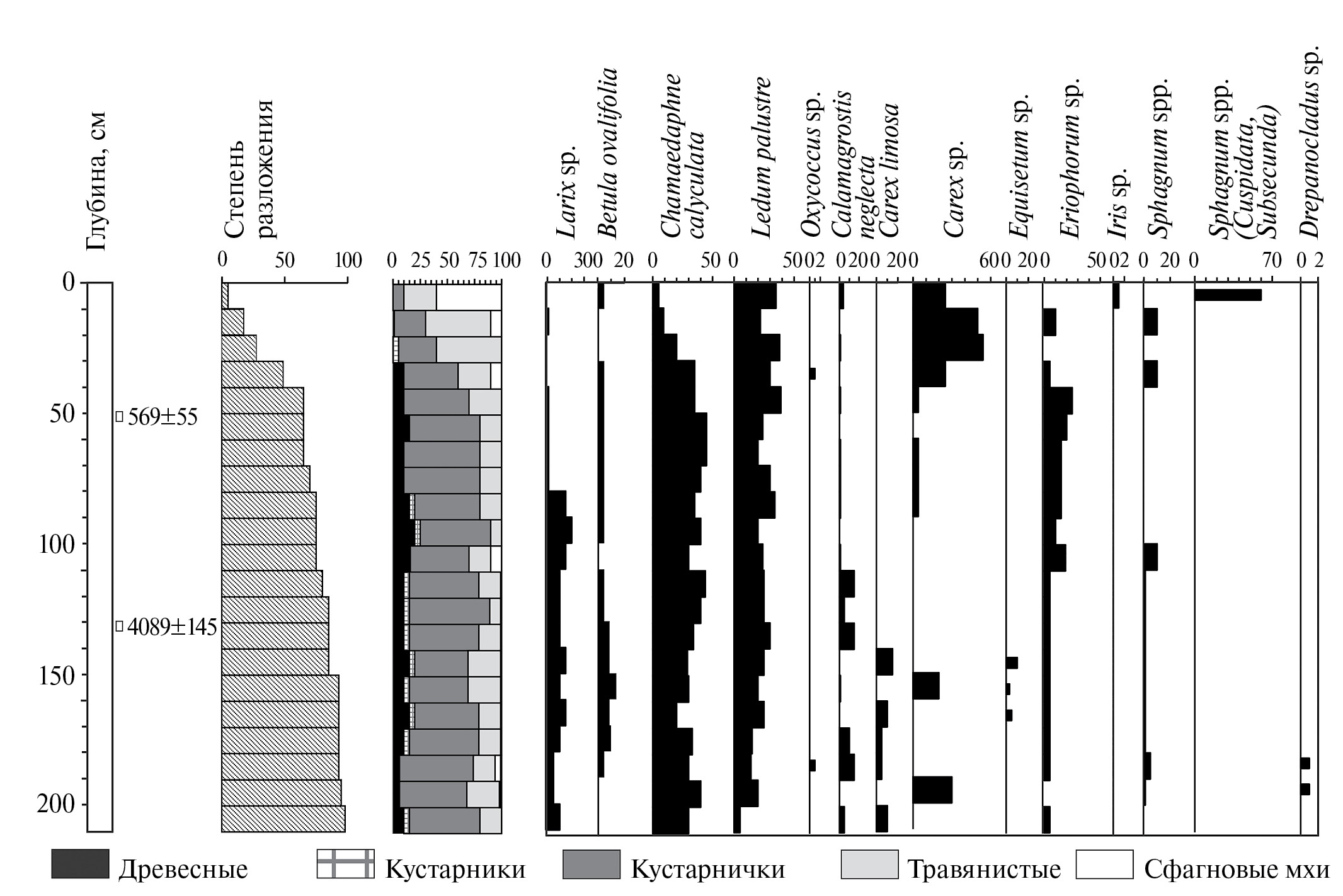 Торфяная залежь мощностью 1.9–2 м низинно-переходного типа имеет типичное для мезотрофных болот Среднеамурской низменности строение (Prozorov, 1961), сложена в основании травяно-древесно-кустарничковыми низинными, выше – травяно-кустарничковыми переходными торфами (рис. 2). Возраст торфяника составляет (9972 ± 166) кал. л. н. (Bazarova et al., 2014; Peskov et al., 2020). Сфагновые мхи встречаются в залежи фрагментарно, их доля увеличивается от основания залежи к верхним слоям с 5 до 20%, сильно колеблясь по слоям.