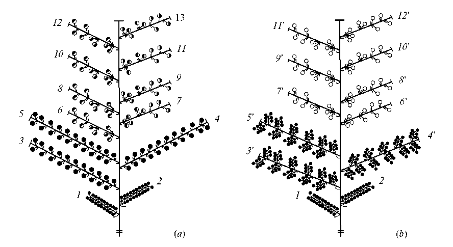 Рис. 2. Схема синфлоресценции Dorema microcarpum: a – открытая ярусная кисть из ярусных кистей из простых зонтиков (2021–2022 гг.); b – синфлоресценция с паракладиями (2023 г.); 1, 2 – боковые кисти с недоразвитыми зонтиками из тычиночных цветков; 3–5 – боковые кисти с развитыми зонтиками из тычиночных цветков; 3'–5' – паракладии с развитыми зонтиками из тычиночных цветков; 6–13 – боковые кисти с простыми зонтиками из 6–9 обоеполых и 1–5 тычиночных цветков; 6'–12' – боковые кисти с простыми зонтиками из обоеполых цветков (от 6–9 до 15 шт.). Кружками обозначены простые зонтики.