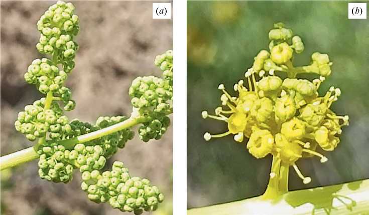 У особей, фаза бутонизации которых в 2023 г. приходилась на более позднее время, чем в 2021–2022 гг., при солнечной, сухой и жаркой погоде локализация тычиночных цветков была другой. Они формировались не только на паракладиях, но и в простых зонтиках на боковых кистях в числе от 1 до 5 (рис. 2b). Таким образом, локализация обоеполых и тычиночных цветков напоминала таковую в предыдущие года исследования. Число тычиночных цветков у более поздно цветущих особей 2023 г. составляет 60–70% общего числа цветков, при этом 30–60% тычиночных цветков располагались на паракладиях, а 30–40% – на боковых кистях синфлоресценции.