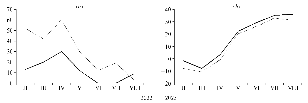 Рис. 4. Изменение относительной влажности воздуха (a) и средней температуры воздуха (b) в 2022 и 2023 гг. По оси Х – месяцы, по оси Y – относительная влажность воздуха (a) или средняя температура воздуха (b).