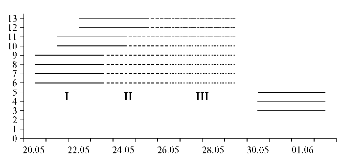 Fig. 5. Flowering of the floral unit in Dorema microcarpum. X-axis – dates, Y-axis – numbers of the lateral tiered racemes (see Fig. 2а); I – staminate stage; II – overlapping of staminate and stigma stages; III – stigma stage.
