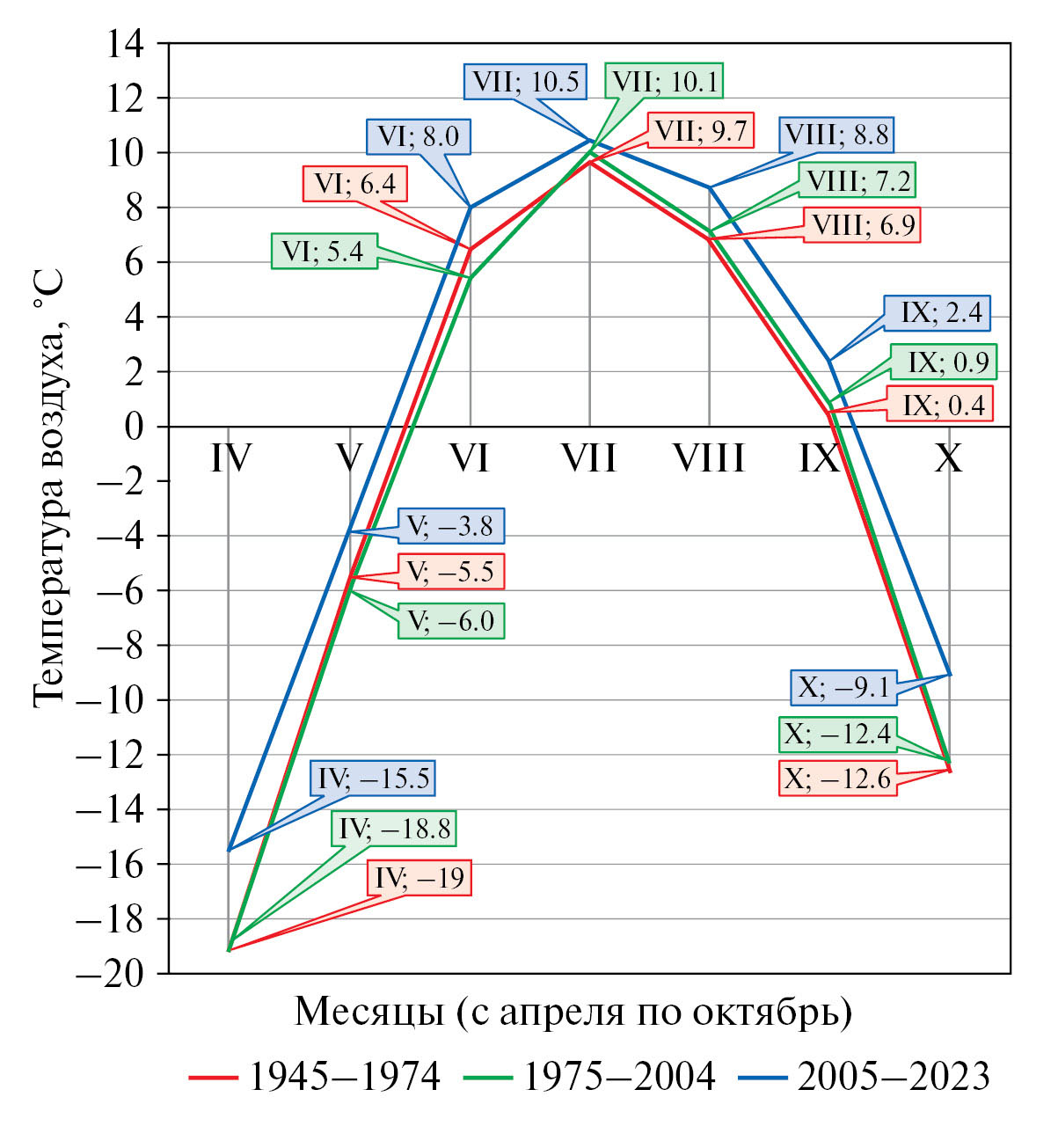 Fig. 1. Variation of average monthly air temperature, °C, over three long-term periods (1945–1974; 1975–2004; 2005–2023) according to the weather station in the village Chokurdakh (70°37ʹ N, 147°53ʹ E).