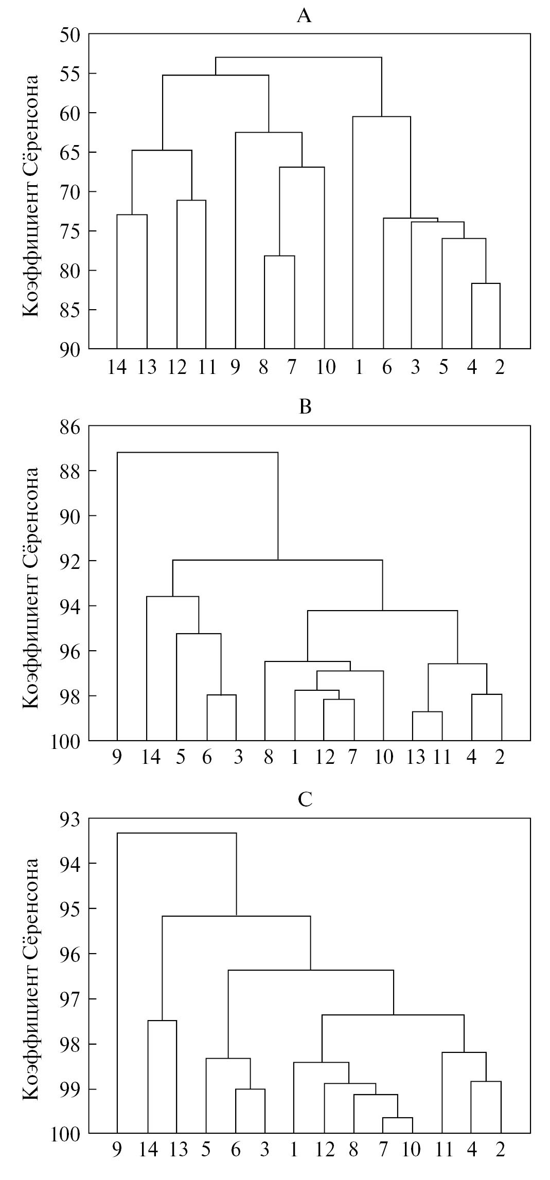 Рис. 2. Дендрограммы сходства сравниваемых локальных флор: А – по видовому составу; B – по родо-видовым спектрам; C – по долготно-групповым географическим спектрам. Примечание: Номерами на дендрограммах обозначены локальные флоры: 1 – пос. Юрюнг-Хая, р. Анабар-низовья; 2 – о-в Тит-Ары, левобережье р. Лены; 3 – р. Булкур, левобережье р. Лены; 4 – р. Арангастах и р. Бедер, правобережье р. Лены; 5 – о-в Тас-Ары, правобережье р. Лены; 6 – р. Огоньюр-Юрэге, правобережье р. Лены; 7 – пос. Чокурдах, левобережье р. Индигирки, 8 – Бурулгинский мыс, правобережье р. Индигирки; 9 – р. Шандрин, среднее течение, бас. Колымской протоки р. Индигирки; 10 – пос. Походск, Походская протока, левобережье р. Колымы; 11 – устье р. Каменушки, правобережье р. Колымы; 12 – мыс Крутая Дресва, правобережье р. Колымы; 13 – верховья р. Лельвергыргын, Анюйское нагорье, Западная Чукотка; 14 – ручей Лесной, приток р. Иргунейвеем, Анюйское нагорье. Полужирным шрифтом выделена обсуждаемая флора.