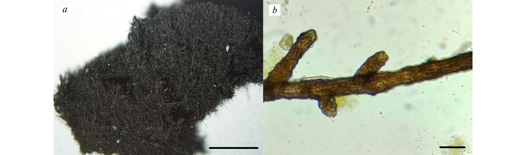 Рис. 1. Таллом Cystocoleus ebeneus: a – внешний вид одной дернинки; b – отдельная ветвь.