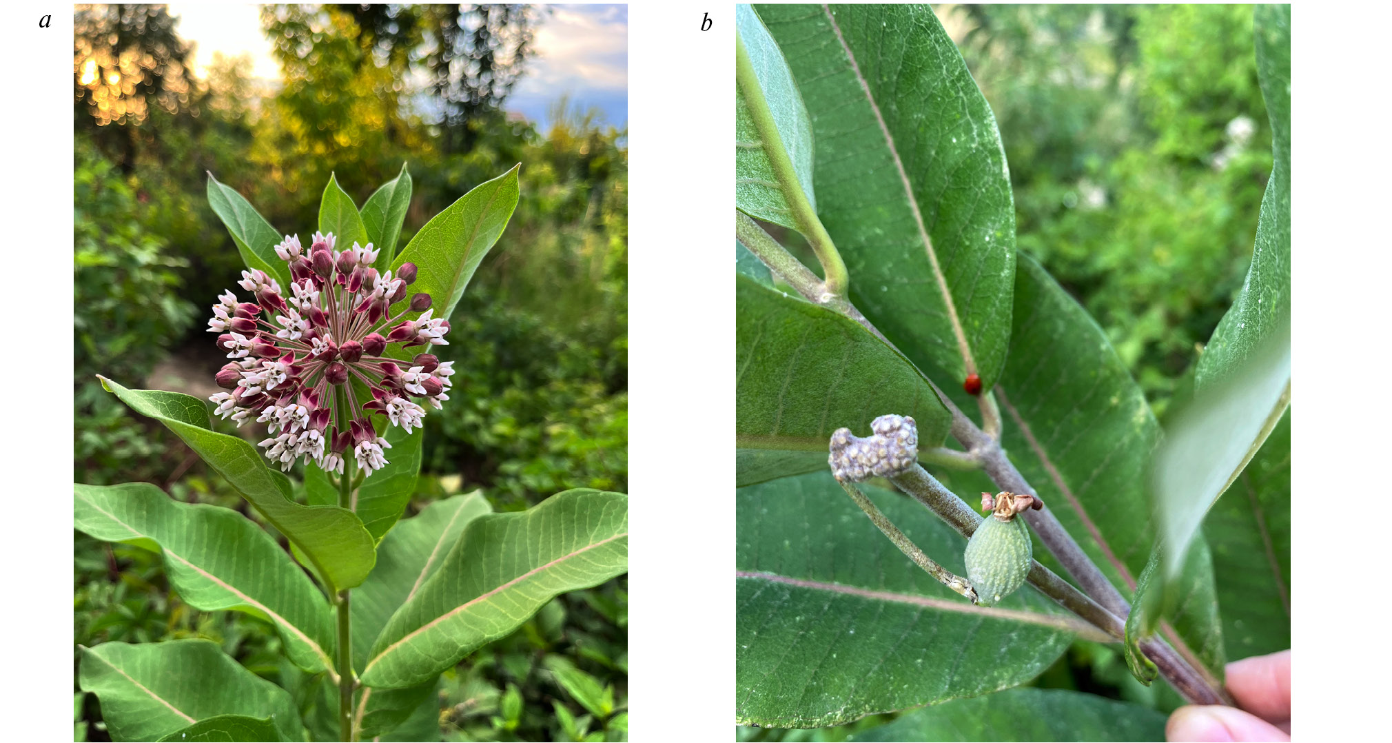 A. syriaca на исследованном участке в 2023 г. был представлен небольшой куртиной (площадью 70 см2) из шести побегов, высотой от 0.7 до 1.52 м, и лишь у одного из них отмечалось цветение (18.06.2023) (рис. 1a) и плодоношение (18.07.2023) (рис. 1b). При наблюдении за видом в 2024 г. отмечено увеличение занимаемой им площади до 120 см2, а также возросло количество побегов до восьми штук. Число цветущих побегов возросло до трех. Семенное возобновление не отмечено.