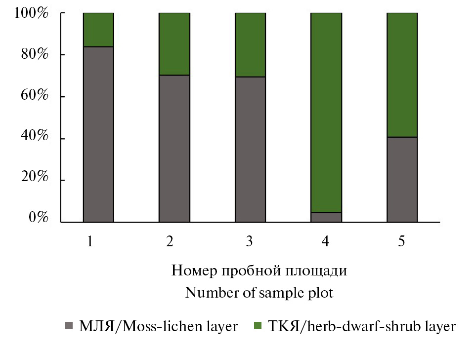 В фоновых сосновых лесах основной вклад в общий запас надземной биомассы вносит мохово-лишайниковый ярус (рис. 7), причем доля лишайников составляет свыше 90%, а доля мхов не превышает 10%. В пределах буферной зоны вклад мохово-лишайникового яруса в общий запас биомассы снижается до 70% и достоверно не различается на ПП4 и ПП5. На территории импактной зоны его доля уменьшается до 5–40%, т. е. здесь напочвенный покров сформирован практически только травяно-кустарничковым ярусом.