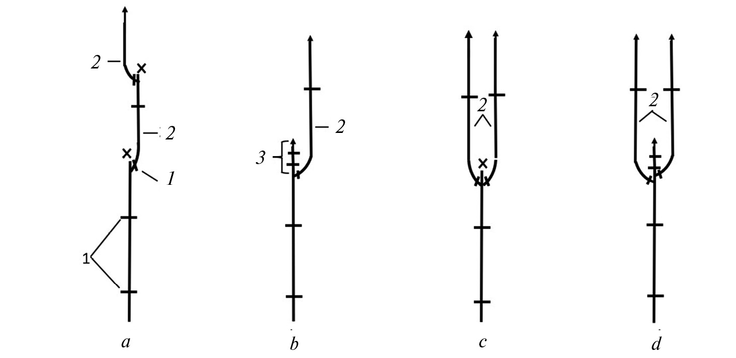 Fig. 6. Options for the transition from monopodial to sympodial growth of the trunk: a – the acrosympodial growth due to abortion of the top of the shoot; b – the acrosympodial growth due to a slowdown in the growth of shoot from the apical bud; c – the false dichotomy growth due to abortion of the top of the maternal shoot; d – the false dichotomy growth due to a slowdown in the growth of maternal shoot.