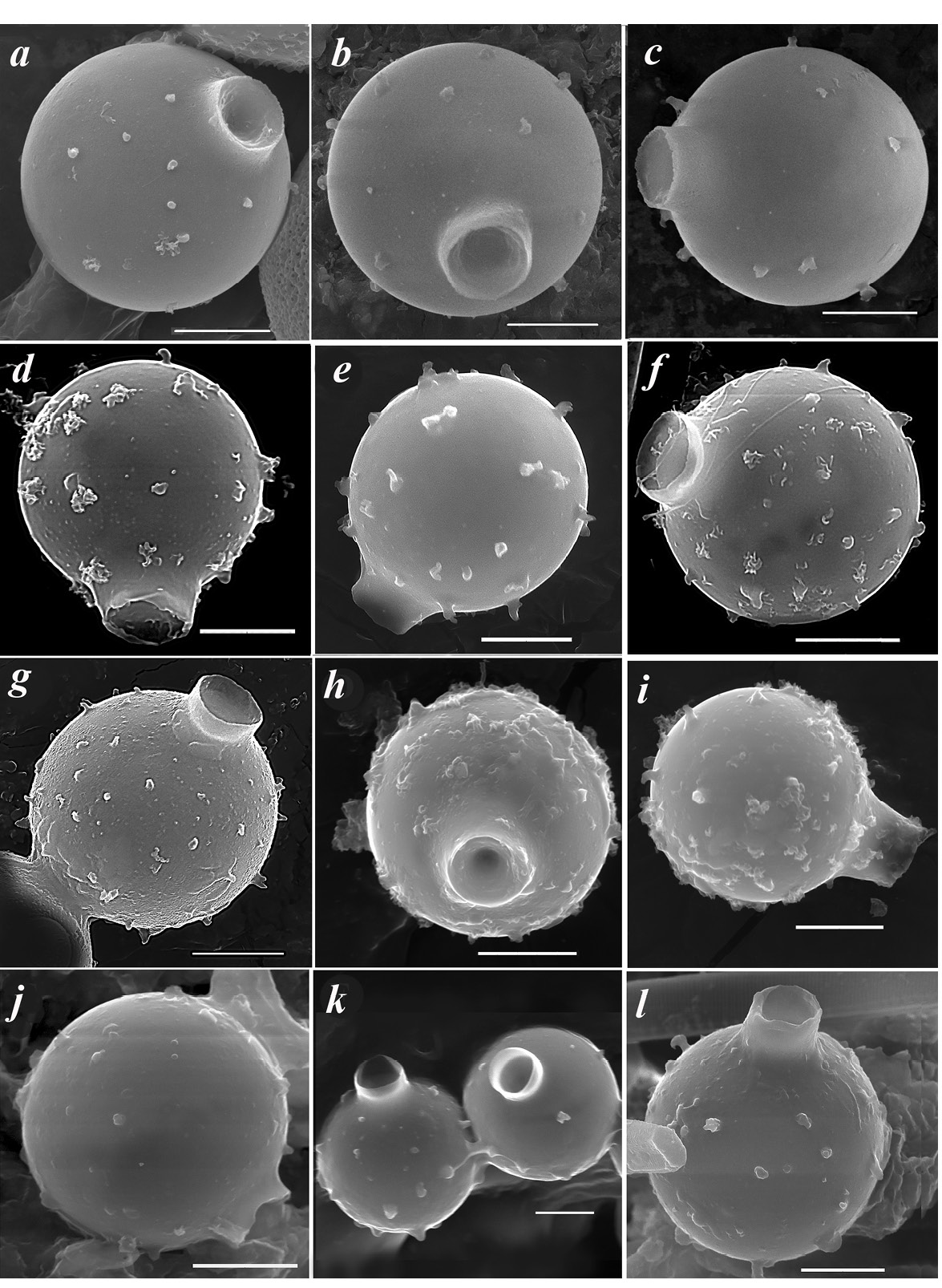 Рис. 1. Стоматоцисты Uroglena kukkii (СЭМ) из российских популяций: а , b , c – из Фигурного пруда ботанического сада г. Санкт-Петербург; южноуральская популяция: d , е , f , i – из оз. Кошкуль; g – из р. Сорокина; j , k , l – из пруда городского пляжа (дериват оз. Тургояк); h – из оз. Сириккуль.