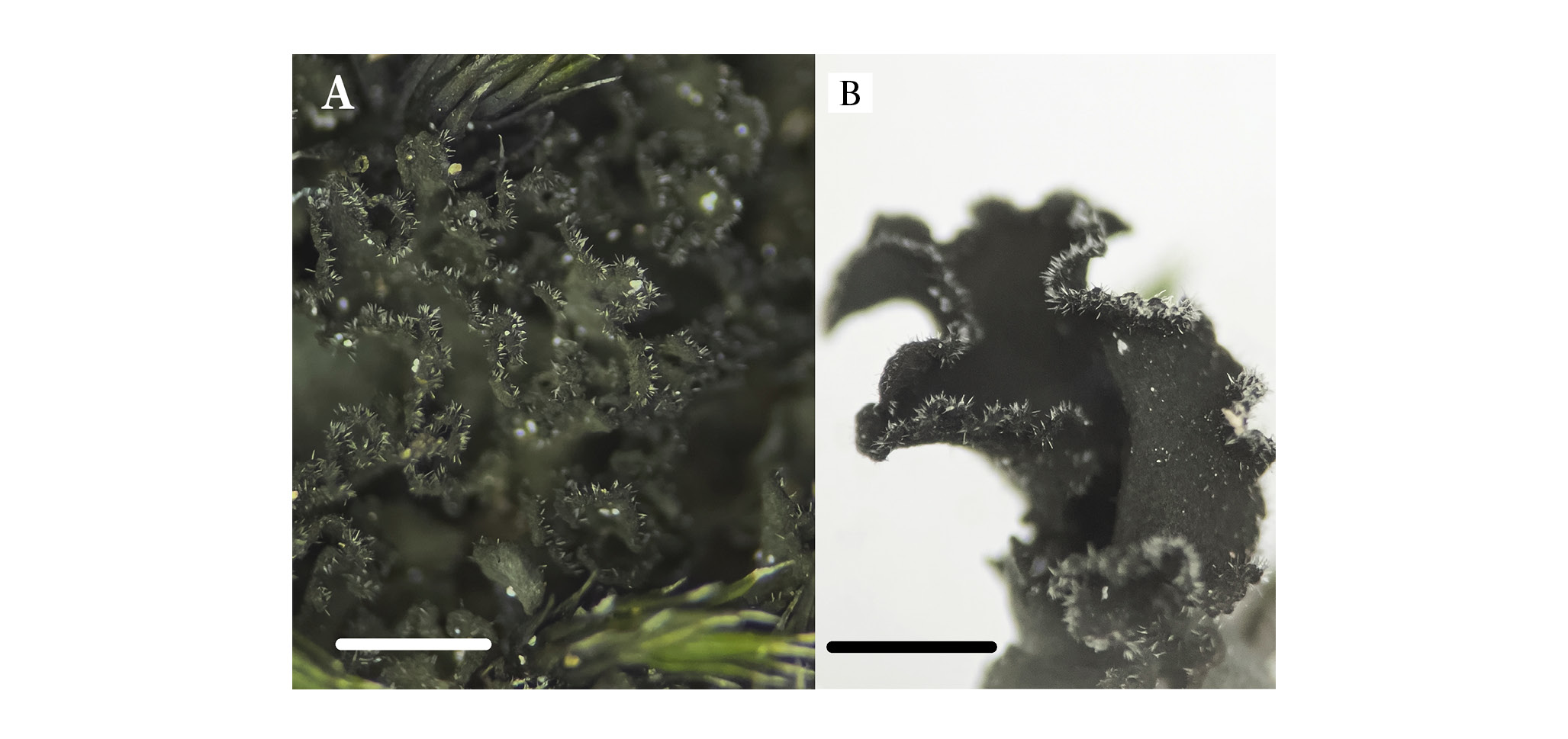Fig. 1. Leptochidium albociliatum : A – habitus, B – single lobe with transparent hairs.