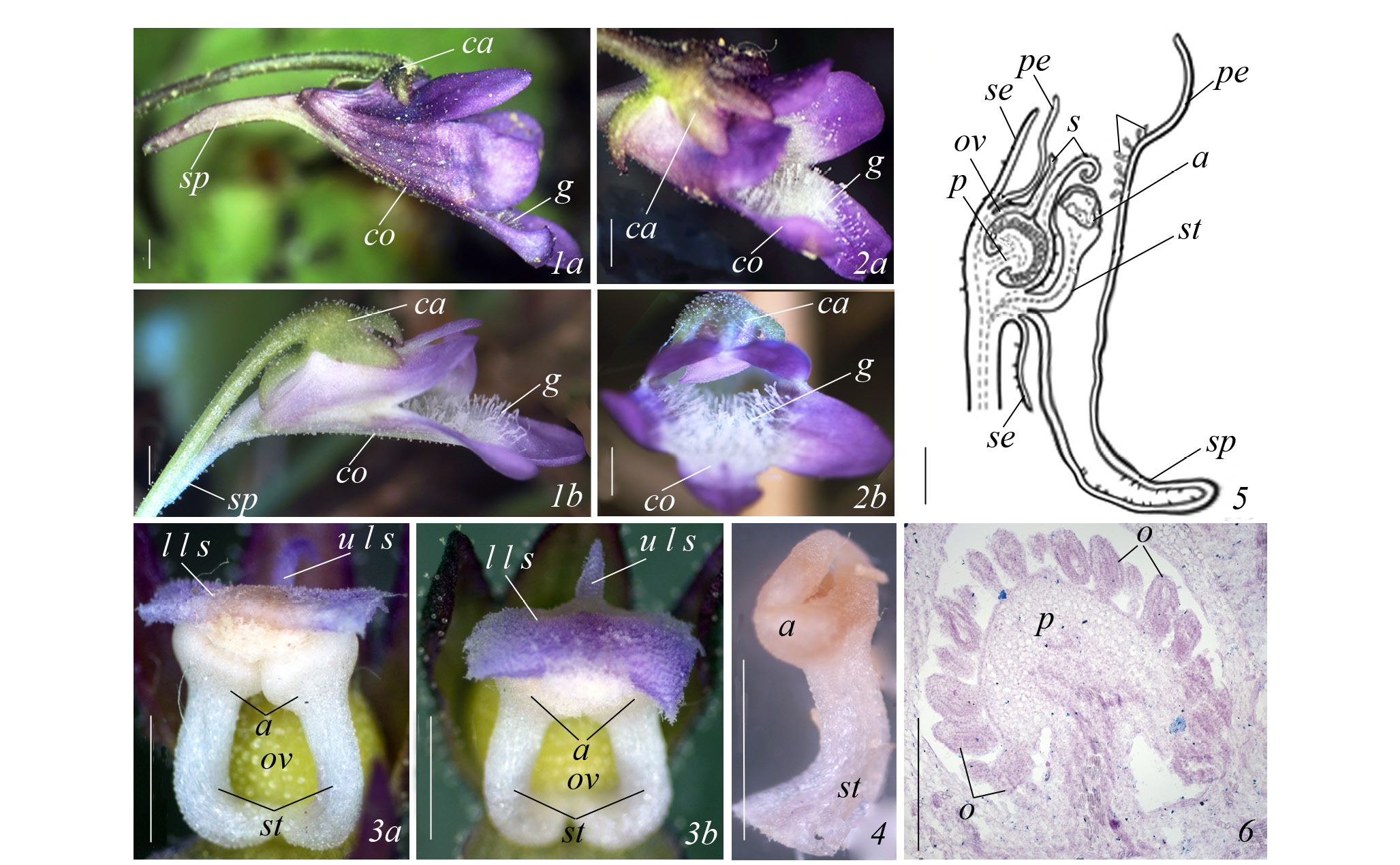 1а–2b – external view of the flower (1a, b – side view, 2a, b – front view), 3a, b – reproductive organs – pistil and 2 stamens in close contact (front view), 4 – stamen (opening furrow is visible in the apical part of the anther), 5 – flower structure on the longitudinal section (scheme), 6 – placenta of ovary with numerous ovules; a – anther, са – calyx, со – corolla, g – glands, l l s – lower lip of the stigma, о – ovules, ov – ovary, р – placenta, ре – petal, s – stigma, se – sepal, sp – spur, st – stamen filament, u l s – upper lip of the stigma.