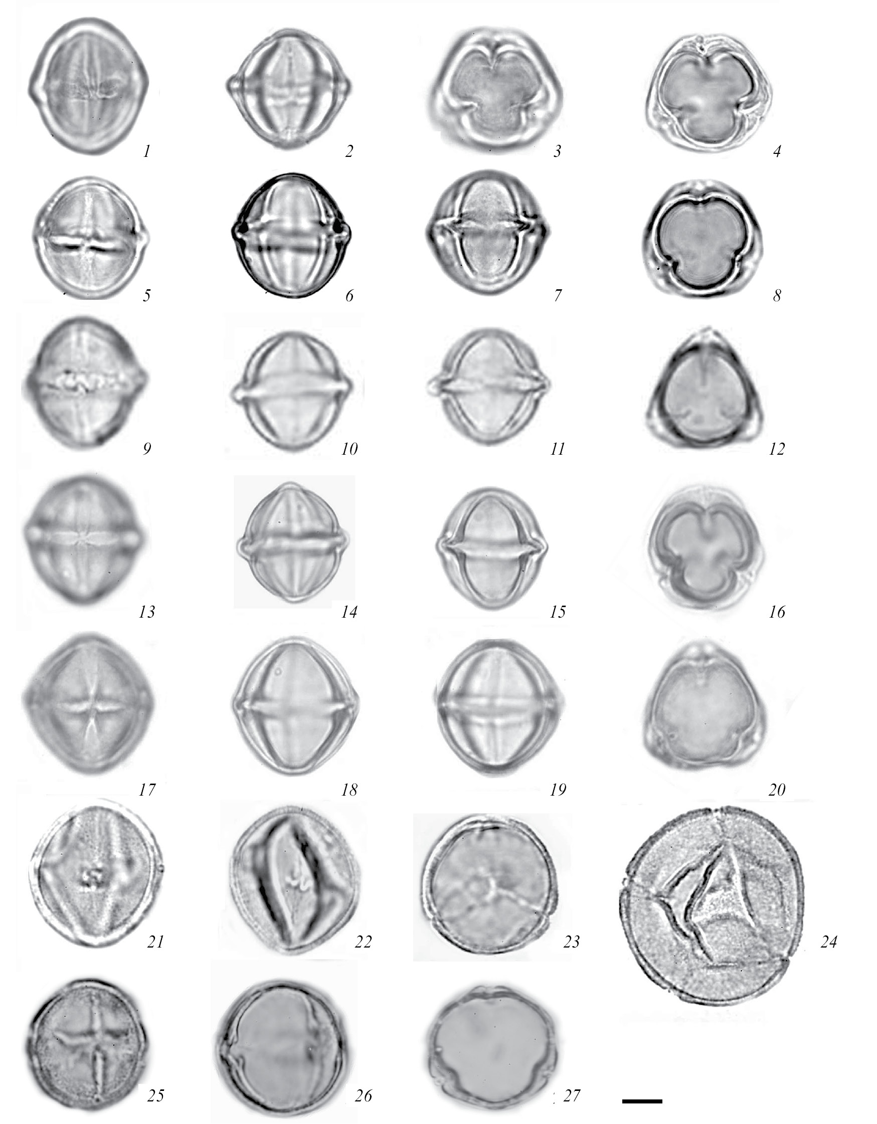 1—4 — Solanum sycocarpum; 5—8 — S. obliquum; 9—12 — S. diploconos; 13—16 — S. sciadostylis; 17—20 — S. bonariense; 21—24 — Jaltomata procumbens; 25—27 — J. umbellata. 1, 2, 5—7, 9—11, 13—15, 17—19, 21, 22, 25, 26 — вид пыльцевого зерна с экватора. 3, 4, 8, 12, 16, 18, 20, 23, 27 — вид пыльцевого зерна с полюса. 24 — атипичное пыльцевое зерно, вид с полюса. Масштабная линейка, мкм: 1—27 — 10.