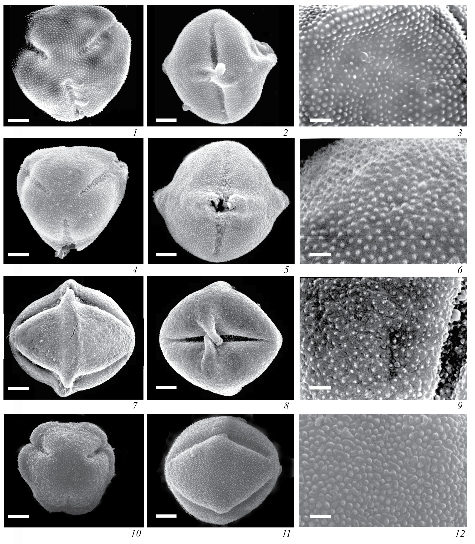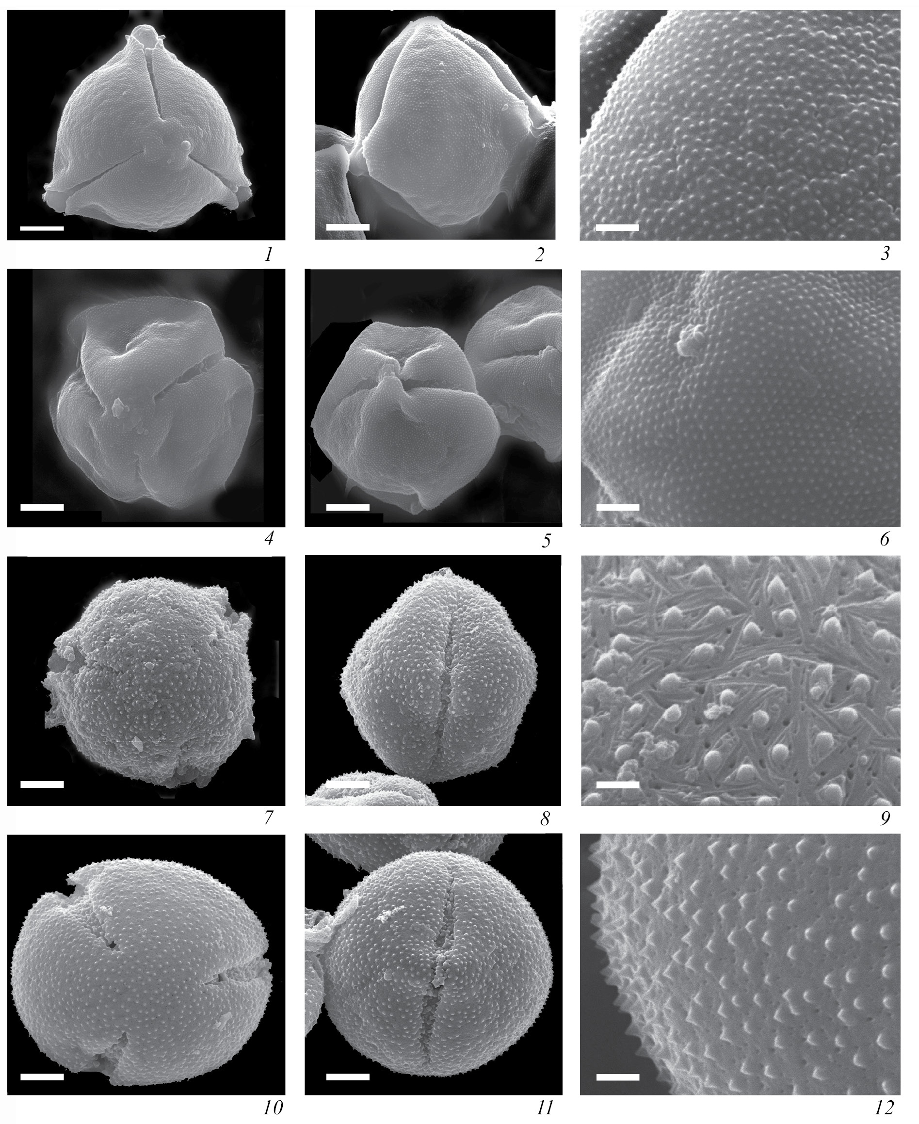 Скульптура поверхности пыльцевых зерен (рис. 2, 3, 6, 9, 12; рис. 3, 3, 6, 9, 12). У пыльцевых зерен всех изученных видов скульптура шипиковатая. Скульптурные элементы микроскопические, хорошо различимы только при высоких увеличениях СЭМ. Шипики конические (в боковой проекции треугольные) в проекции сверху часто выглядят как микроскопические гранулы или бородавки, более или менее одинаковые по величине.