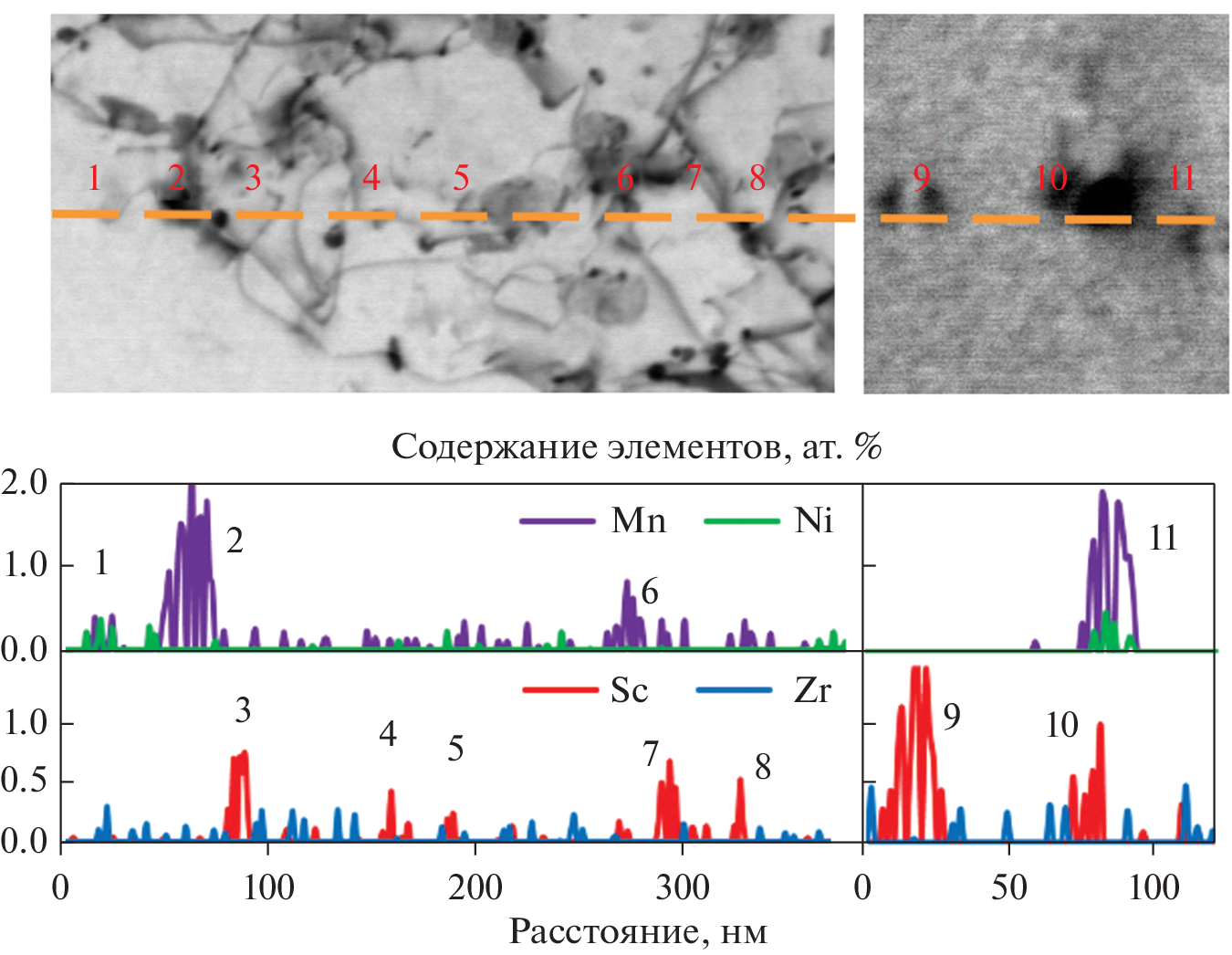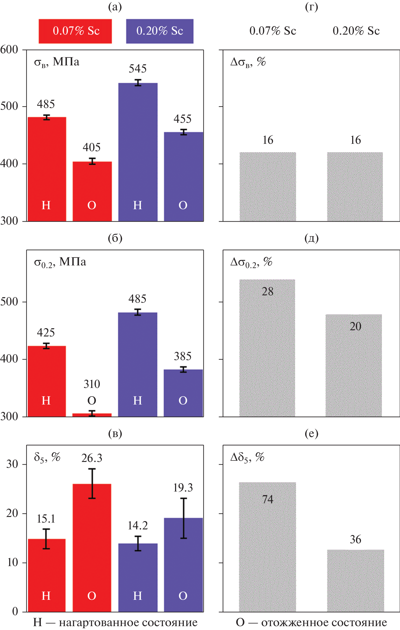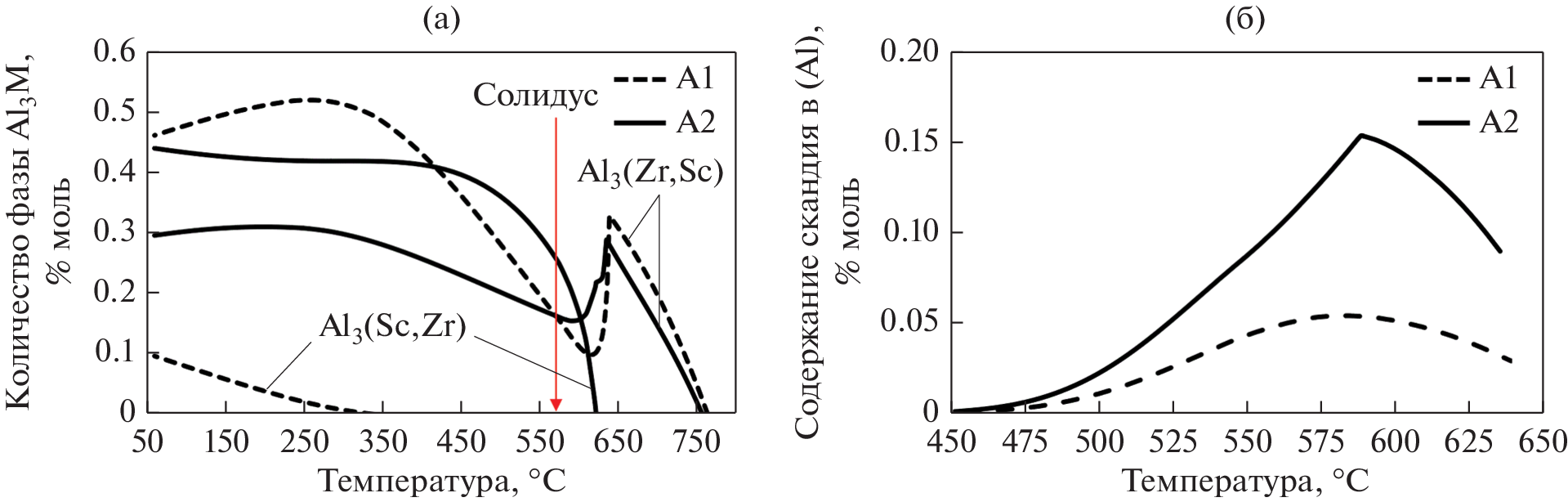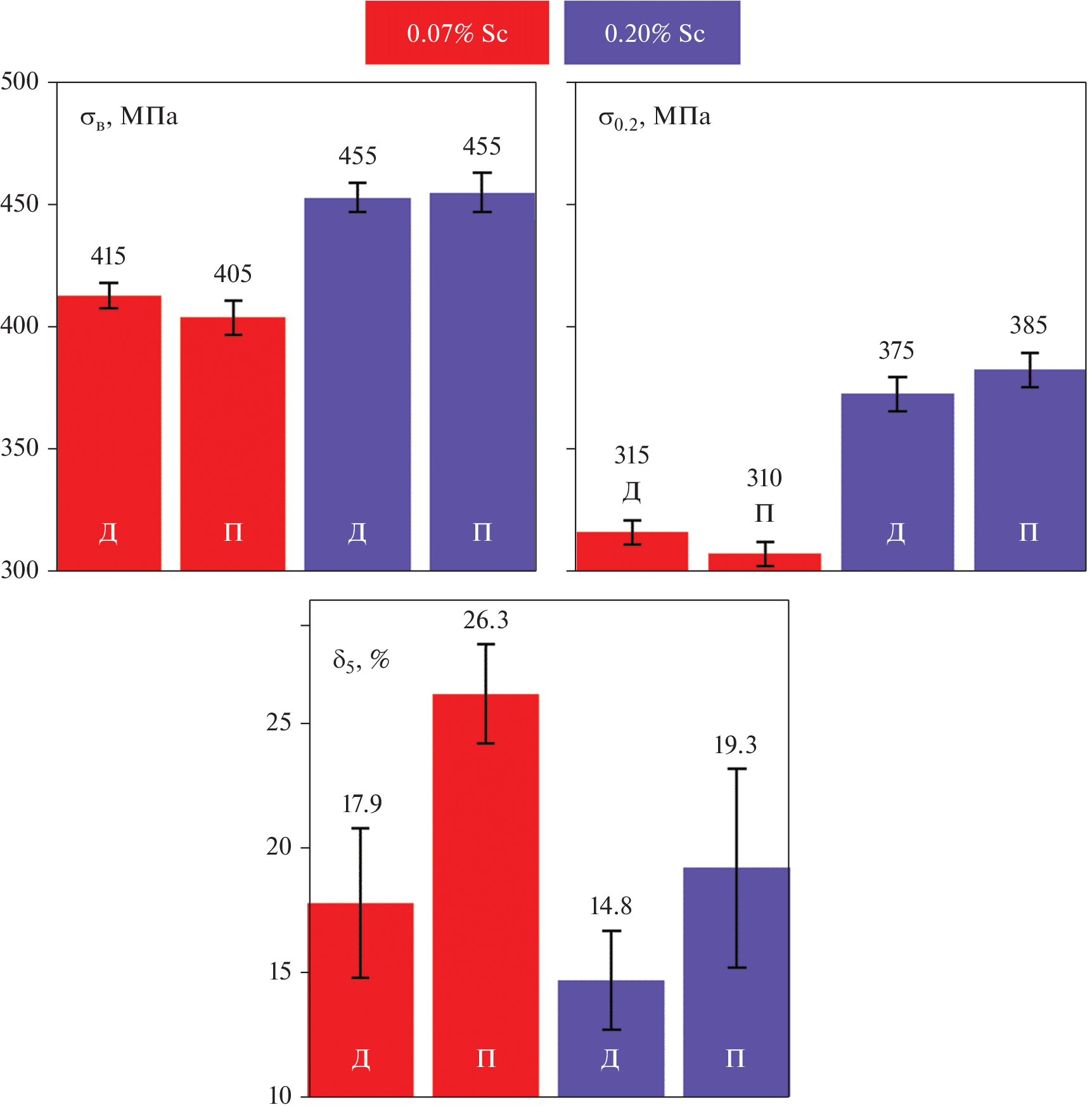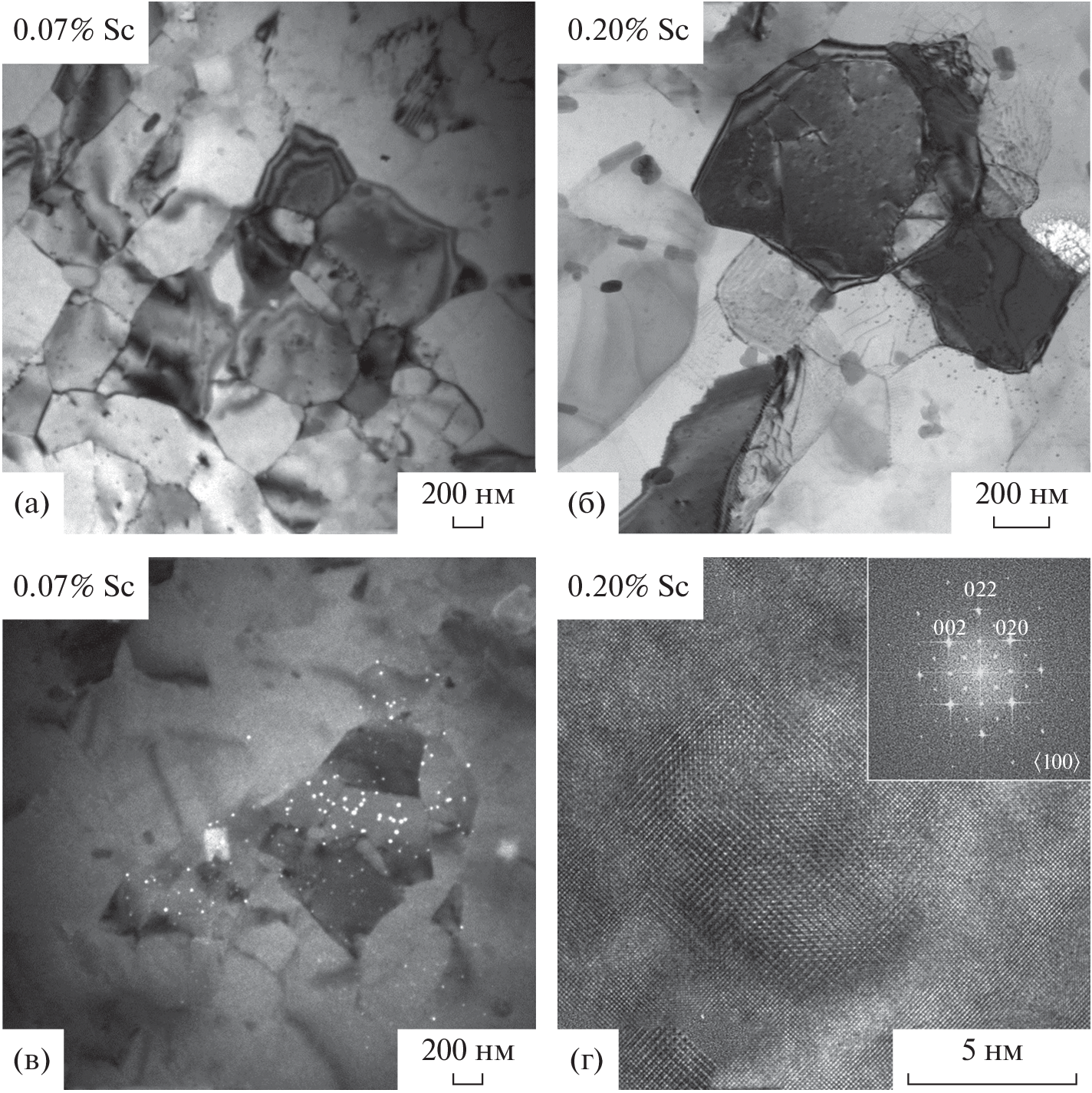 Round ingots 110 mm in diameter and cold-rolled sheets 2 mm in thickness, which were made of experimental Al–Mg–Sc alloys containing different scandium content (0.07, 0.20 wt %), have been studied. Transmission electron microscopy and thermodynamic simulation have been used to investigate the peculiar-ities of the structural-phase state of the material. A reduction in scandium content from 0.20 to 0.07% has been found to result in a twofold increase in the grain size in ingots, a 46% drop in hardening of ingots after homogenization, and a 10–20% decrease in the strength of annealed sheets, which has been caused by a smaller amount of the key phase, Al3(Sc, Zr). A good level of strength characteristics of experimental annealed sheets made of alloy with low scandium content 0.07 wt % (σu > 400 MPa, σ0.2 > 300 MPa) has been achieved and it is higher than that of the traditional AMg6 alloy (σu > 350 MPa, σ0.2 > 150 MPa).