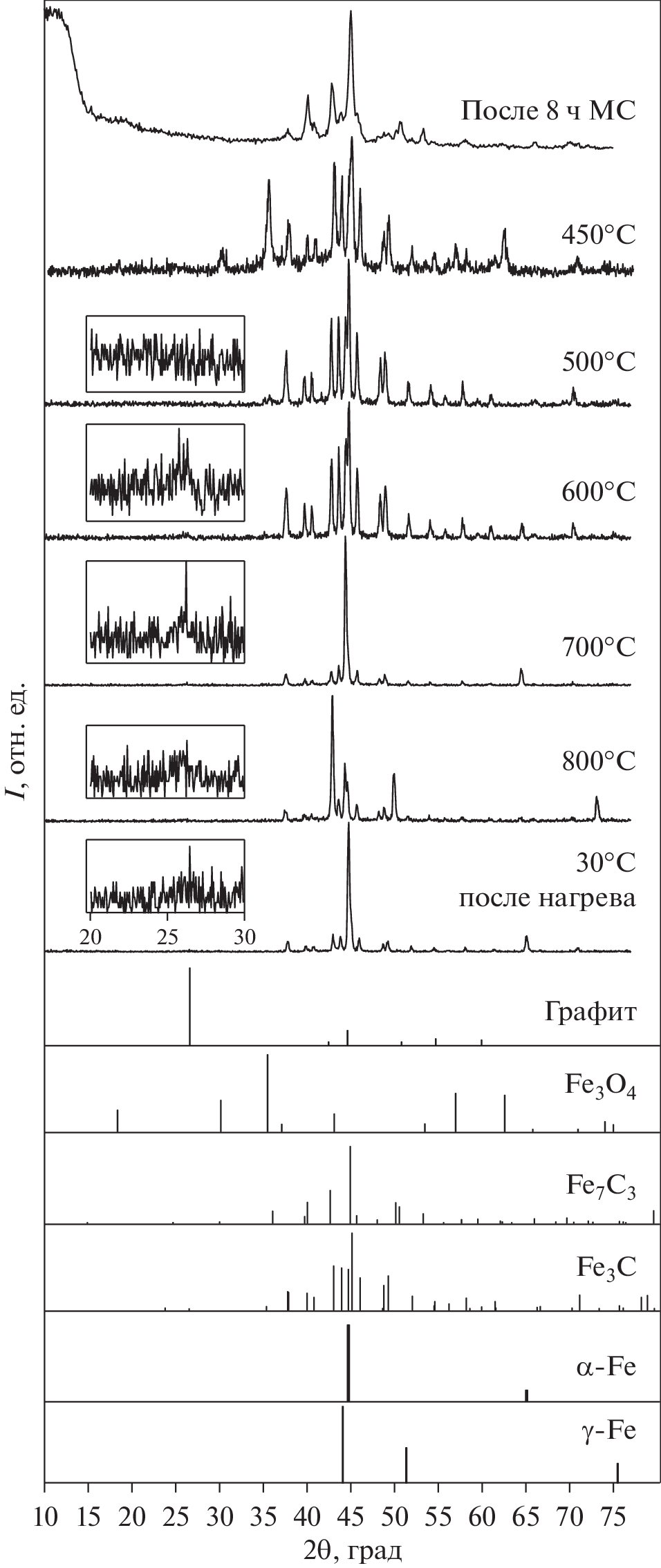 cooling from 800–1000°C the mechanocomposite consists of α-Fe, cementite Fe3C, and graphite. The phase