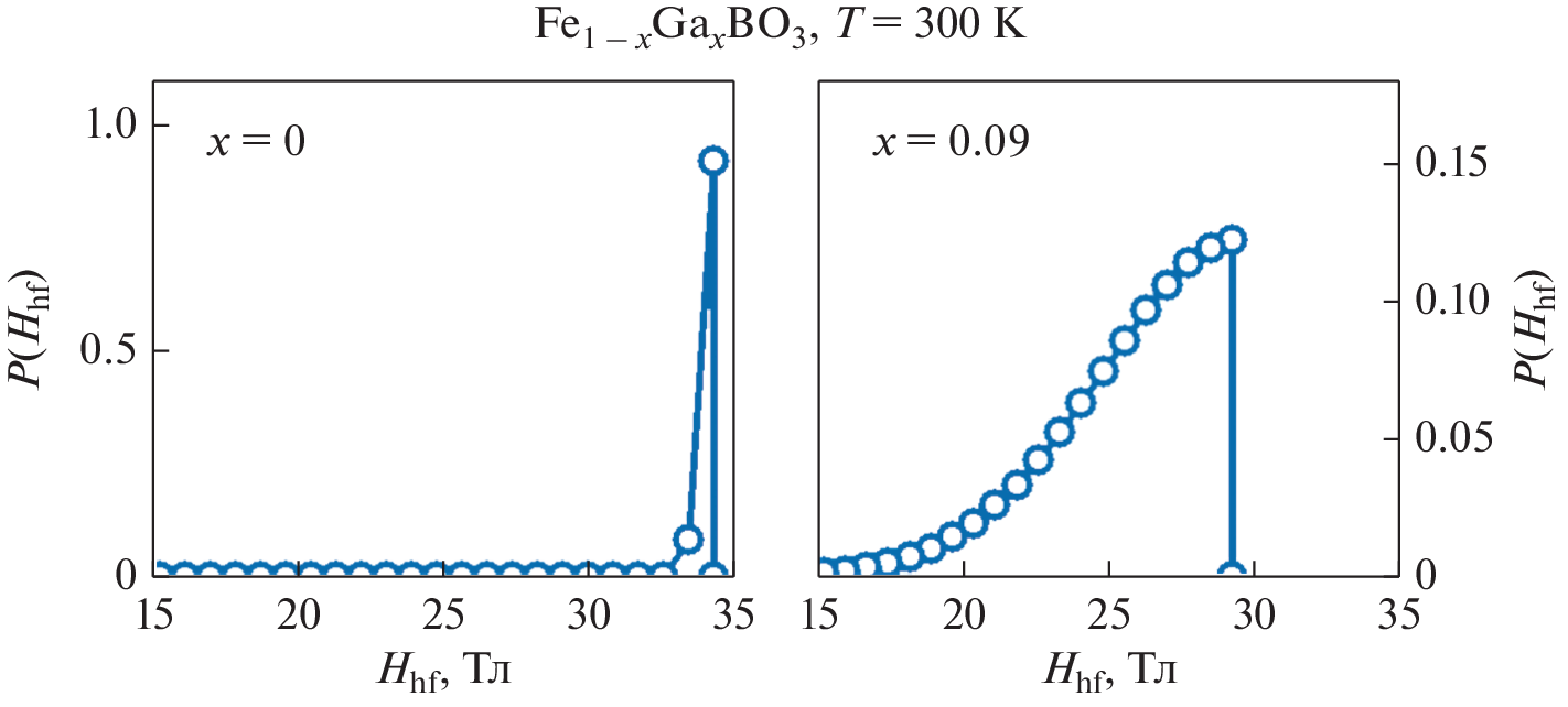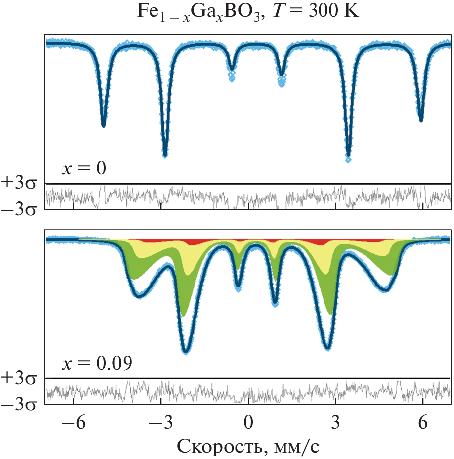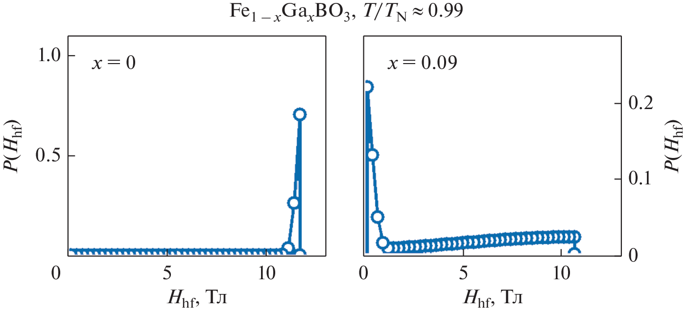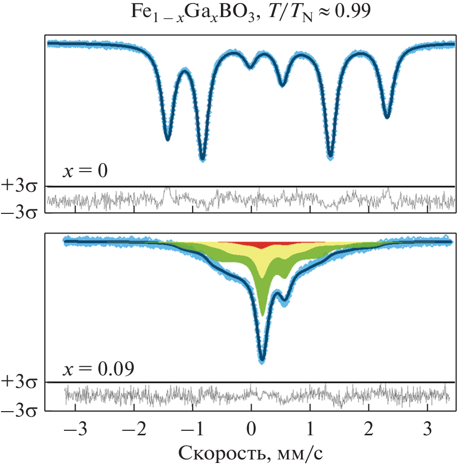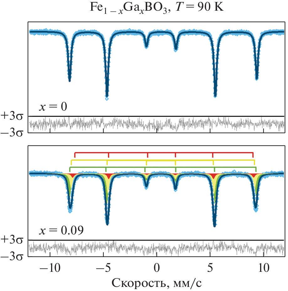 FeBO3, which manifests itself in the appearance of additional components in the Mössbauer spectra of the Fe0.91Ga0.09BO3 single crystal.