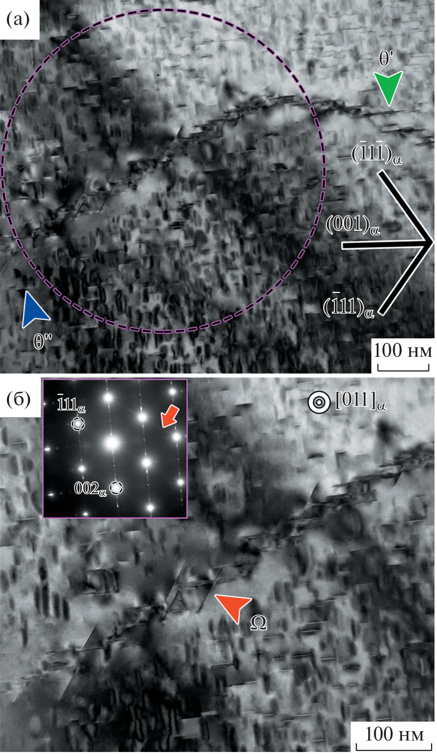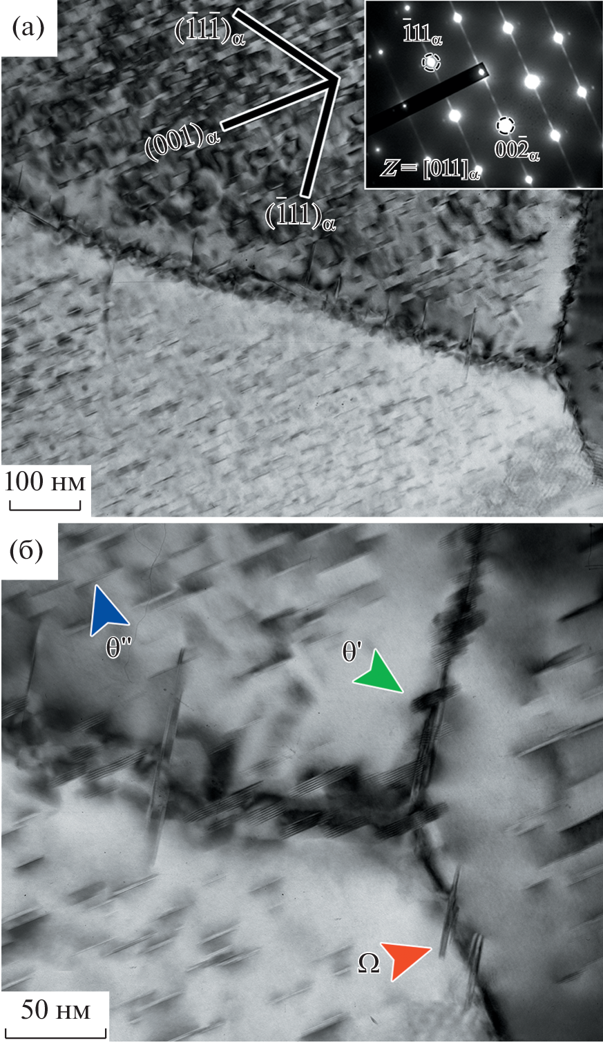 The precipitation of Ω-phase {111}α plates in the Al–Cu–Mg alloy has been investigated at a Cu/Mg ratio > 10 and low Si content. Unlike Al–Cu–Mg alloys containing Ag, nanoscale plates with an {111}α habit plane has been found for the first time to precipitate in the alloy according to a heterogeneous mechanism, namely, along low-angle boundaries, dislocation lines, and at the θ′-phase/Al-matrix interphase