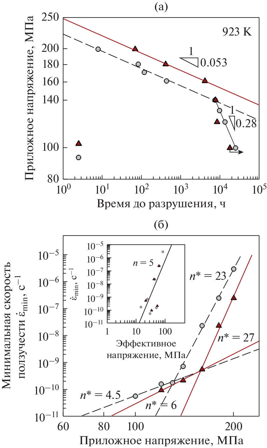 Structural evolution of the tempered lath martensite of the 10% Cr--3% Co steel microalloyed with rhenium and copper with a low nitrogen content and a high boron content during creep at 923 K was investigated for the purpose of establishment of the rison of decrease in creep resistance of this steel under the low applied stress. The tempered martensite lath structure of 10%Cr-3%Co steel with an average lath size of 370 nm and a high dislocation number density of 2 ×1014 m–2 was observed after normalizing at 1323 K with the following tempering at 1043 K for 3 h. The structure was stabilized by M23C6 carbides, M6C carbides, and NbX carbonitrides. During long-term creep, the lath structure strongly experienced an evolution: the width of the martensitic laths increased significantly, dislocation density decreased, the Laves phase and Cu-enriched particles remarkably coarsen. Such structural evolution correlates with an appearance of creep strength breakdown on curves “Applied stress vs. Time to failure” and “Minimum creep rate vs. Applied stress”. Significant coarsening of the Laves phase particles and Cuenriched particles via formation of the large particles with sizes more than 250 nm along high-angle boundaries and full dissolution of the fine particles with sizes less than 50 nm along low-angle boundaries of martensite laths is considered to be the main cause of degradation of the creep resistance of the steel studied.