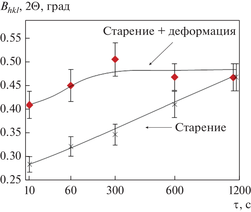 The biomedical alloy Ti-18Zr-15Nb (at.%) with shape memory was subjected to a true deformation e = 0.7 in three different modes: in the temperature range from 20°C to 600°C at deformation rate ξ = 0. 1 s-1; at temperatures 250°C and 300°C with strain rates ξ = 0.1, 1 and 10 s-1; deformation at 300°C and strain rate ξ = 0.1 s-1 after annealing at 300°C (τ = 10, 60, 300, 600 and 1200 s). It is established that with increasing temperature the conditional yield strength σ0.2 continuously decreases, at that in the temperature range of deformation temperatures 250°С-300°С the increase of maximum stress σmax is observed. In the temperature range from 200°С to 400°С fluctuations are observed on the flow curves, the amplitude of which increases with increasing temperature. The change σ0.2 and σmax, as well as the presence of oscillations on the strain diagrams are connected with the course of dynamic strain aging accompanied by the release of excess ω-phase particles at temperatures 200°С - 400°С. Increasing the strain rate at temperatures of 250°С - 300°С has a strong effect on the deformation behavior of the alloy due to a significant increase in temperature during the deformation process. Thus, increasing the strain rate up to ξ = 10 s-1 leads to a stepwise decrease in stress, starting from e ≈ 0.3, after which the plastic flow curve acquires a wave-like form with a low frequency of stress fluctuations. The main phase after all modes of thermomechanical tests is the BCC β-phase. At annealing of 300°С and an exposure of more than 300 s weak ω-phase lines are observed, and at deformation after aging significantly broadened ω-phase lines are observed only after prolonged exposure (1200 s).