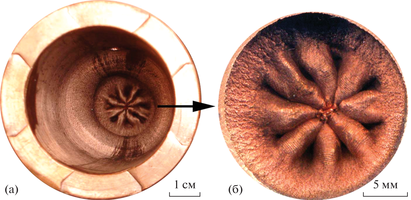 Metallographic method investigated the process of convergence of thick-walled cylindrical copper shells under the action of an explosion. The explosion was initiated from eight points evenly spaced in a circle on the surface of the explosive surrounding the shell. At the intermediate stage of convergence, eight outliers formed on the inner surface of the shell. The convergence of the shells into the cylinder is completed by expanding and closing the emissions. The formation of outliers is explained by the occurrence of plastic (cumulative) jets at the deformation front. Jets occur when adjacent deformation projections collide. Areas of localized deformation were found inside and around the ejections, which is associated with this method of initiating an explosion. It is established that high-speed deformation of copper during the convergence of shells is accompanied by the formation of a large number of twins. There are more twins in the outer zones of the shells than in the inner ones.