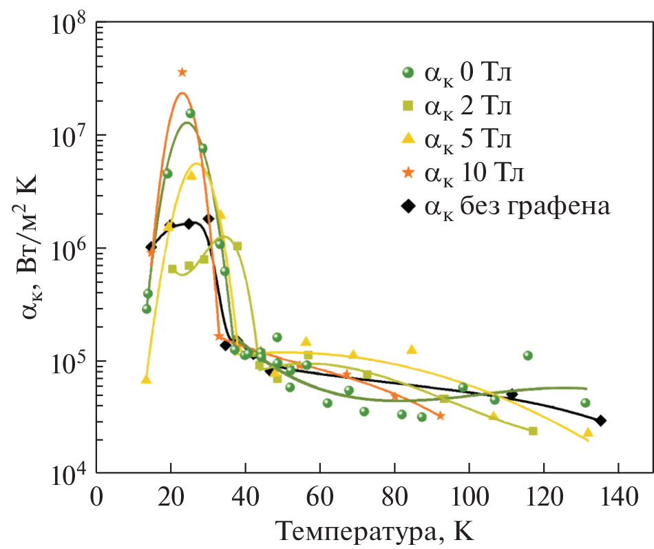 The thermal contact resistance of a detachable connection in copper-copper contact pair with a thermal interface from layers of graphene synthesized by the method of a low pressure chemical vapor deposi-tion on the contact surface was studied. Obtaining the value of the thermal contact resistance of a detachable contact pair copper–graphene–copper by the method of transient heat flow, at a temperature of 15–150 K under the influence of an external magnetic field up to 10 T.