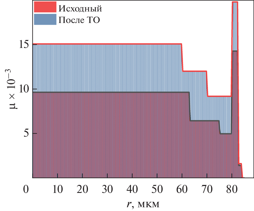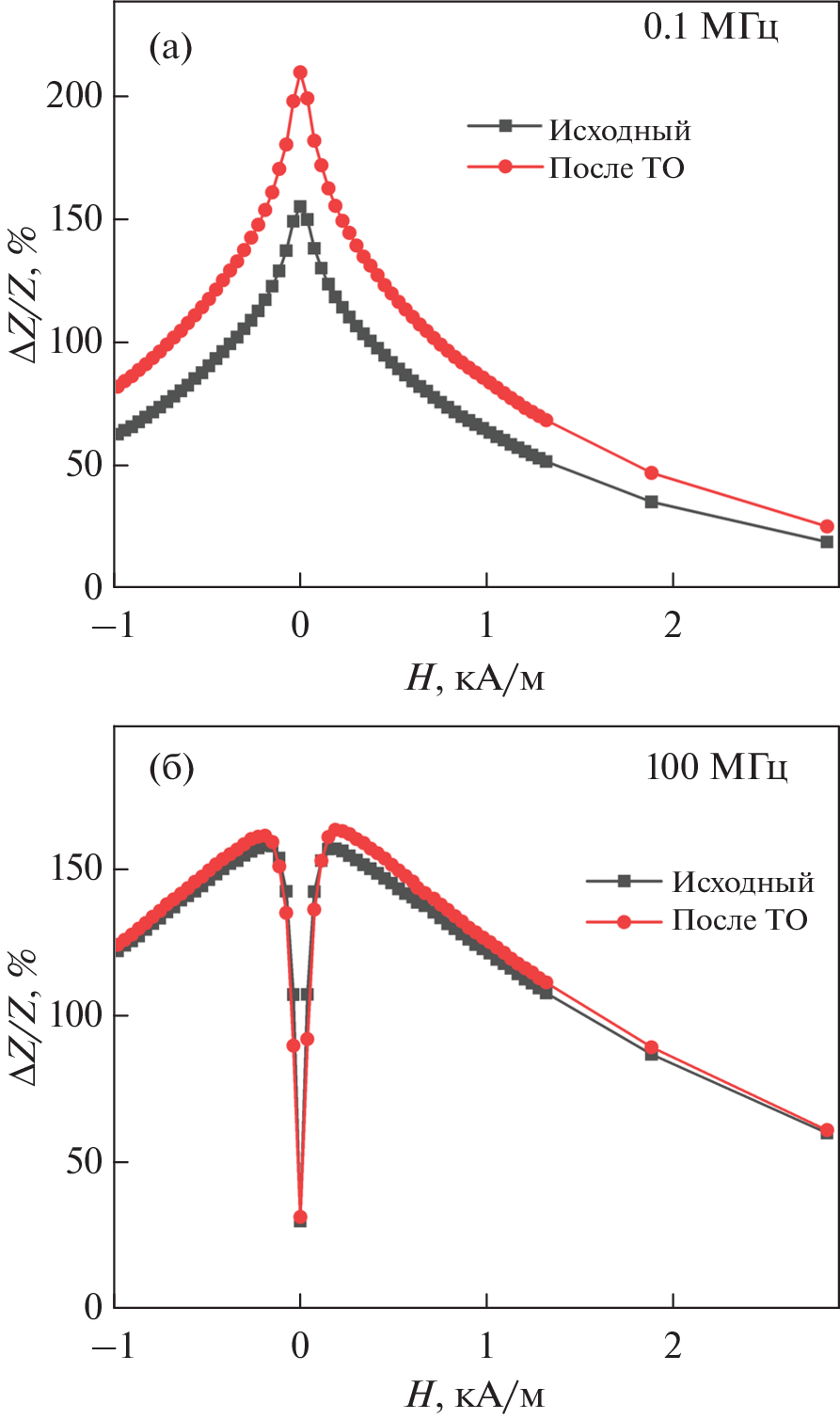 Представлены результаты исследования влияния релаксационного отжига продолжительностью 2 ч при температуре 620 K на магнитоимпедансный эффект (МИ) в аморфных проволоках Co66Fe4Nb2.5Si12.5B15. Обнаружено, что МИ на низких частотах переменного тока после термообработки заметно увеличивается, тогда как на высоких частотах он изменяется слабо. С помощью магнитоимпедансной томографии показано, что это связано с тем, что изменения магнитных свойств, вызванные термообработкой, неодинаковы в различных областях проволоки. Так, в поверхностной области толщиной около 2.5 мкм магнитная проницаемость остается практически неизменной, а во внутренних областях после отжига значительно увеличивается.