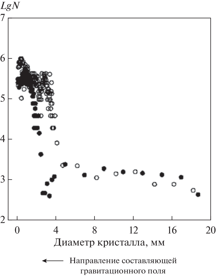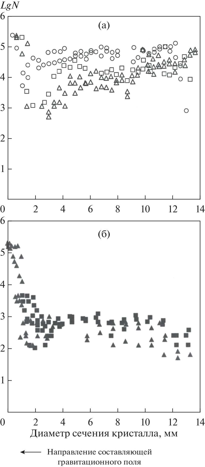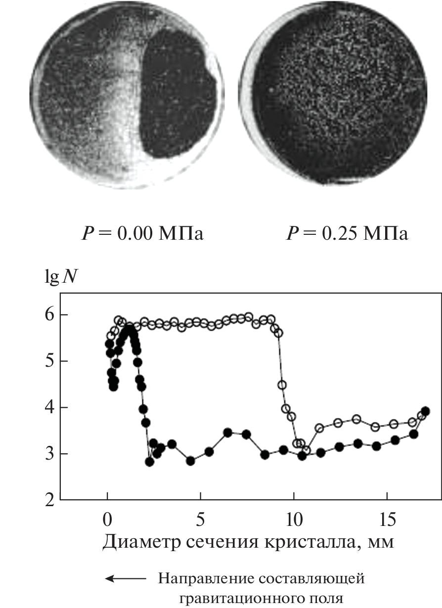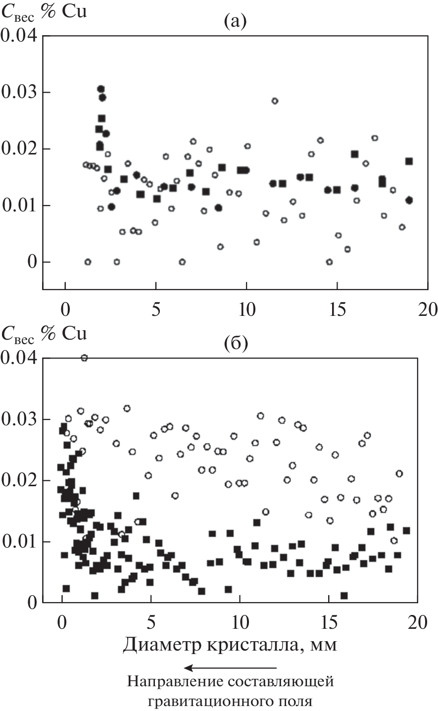 Using quantitative X-ray spectral analysis and metallography, the distribution of copper concentration in the α-solid solution of Al and the dislocation density in single crystals of the Al alloy–0.005 wt % Cu, grown from the melt at different values of argon pressure (Ar) and the gravitational field component (gmg) directed along the surface of the crystallization front. A strong inhomogeneity in the copper concentration measured in adjacent areas of the cross-sectional surface of the crystal and its correlation with the inhomogeneity of the distribution of dislocations in single crystals of the alloy, which depends on pressure and the gravitational field component, were discovered. The mechanism of relaxation of the excess free volume of the phase transformation released in the region of the interphase boundary during crystal growth is considered.