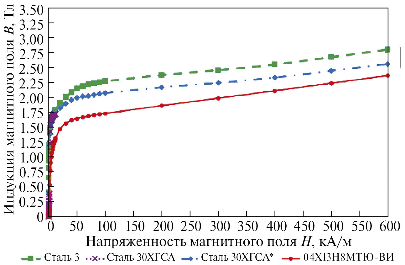 На рисунке 9 можно видеть, что максимальное значение µᵣ стали 30ХГСА в 2.5 раза ниже, чем у стали 3, а у стали 04Х13Н8МТЮ–ВИ, соответственно, в 6 раз ниже относительно стали 3 и, примерно, в 2.4 раза ниже, чем 30ХГСА.