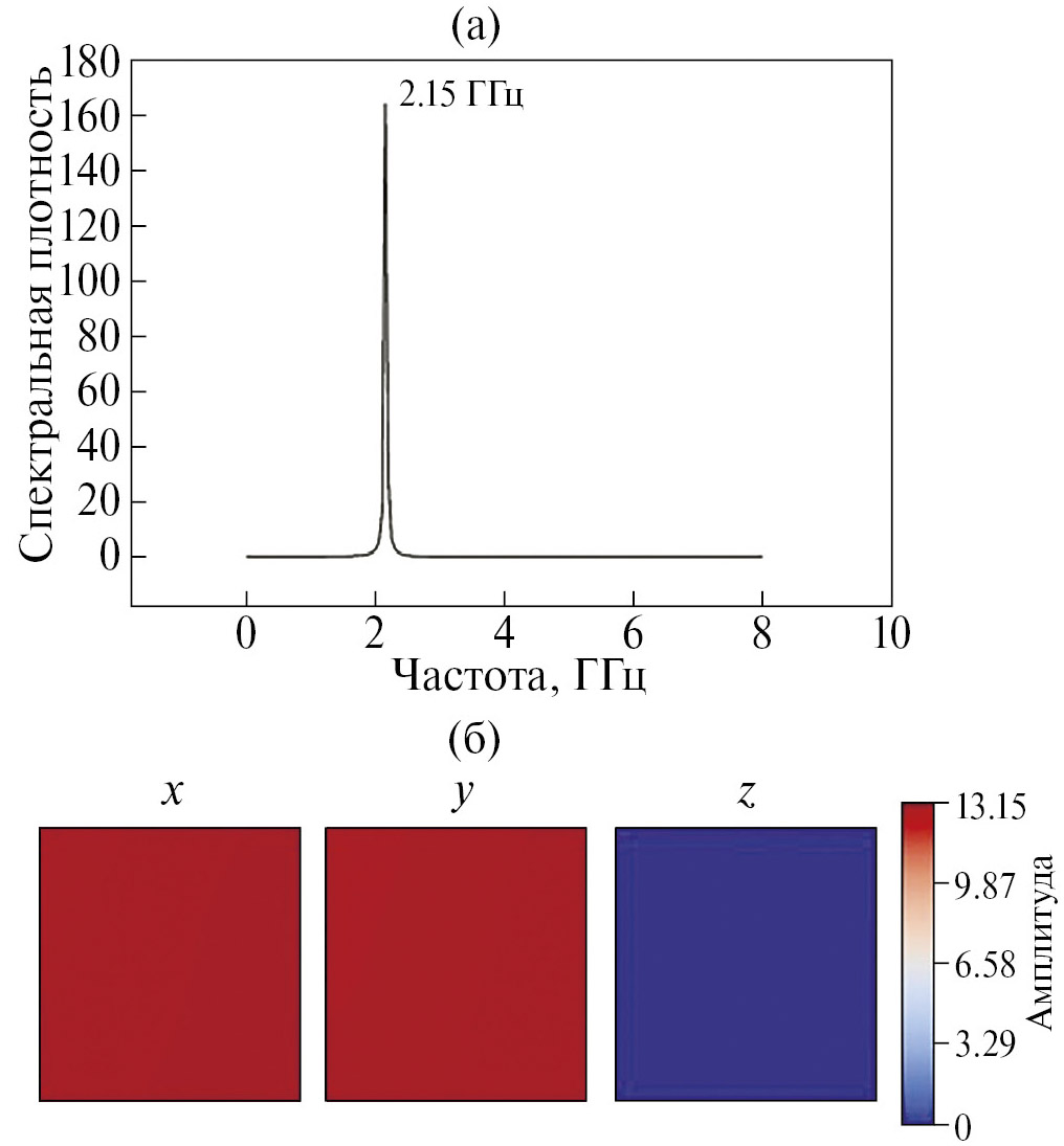 Рис. 1. Зависимость спектральной плотности от частоты (а). Распределение амплитуды колебания по поверхности плёнки для соответствующей моды (б). Плёнка 500 × 500 × 12 нм.