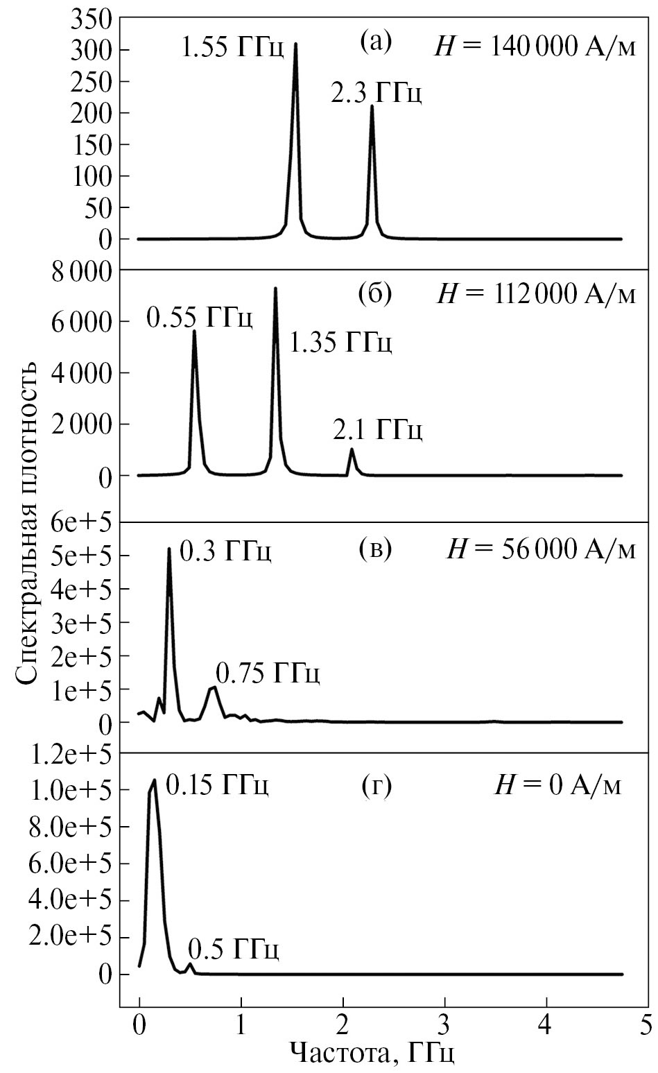 Рис. 3. Зависимость амплитуды спектральной плотности мощности от частоты при различных значениях напряженности магнитного поля. Цифрами у кривых обозначены частоты соответствующих мод. Пластина 200 × 200 × 48 нм.