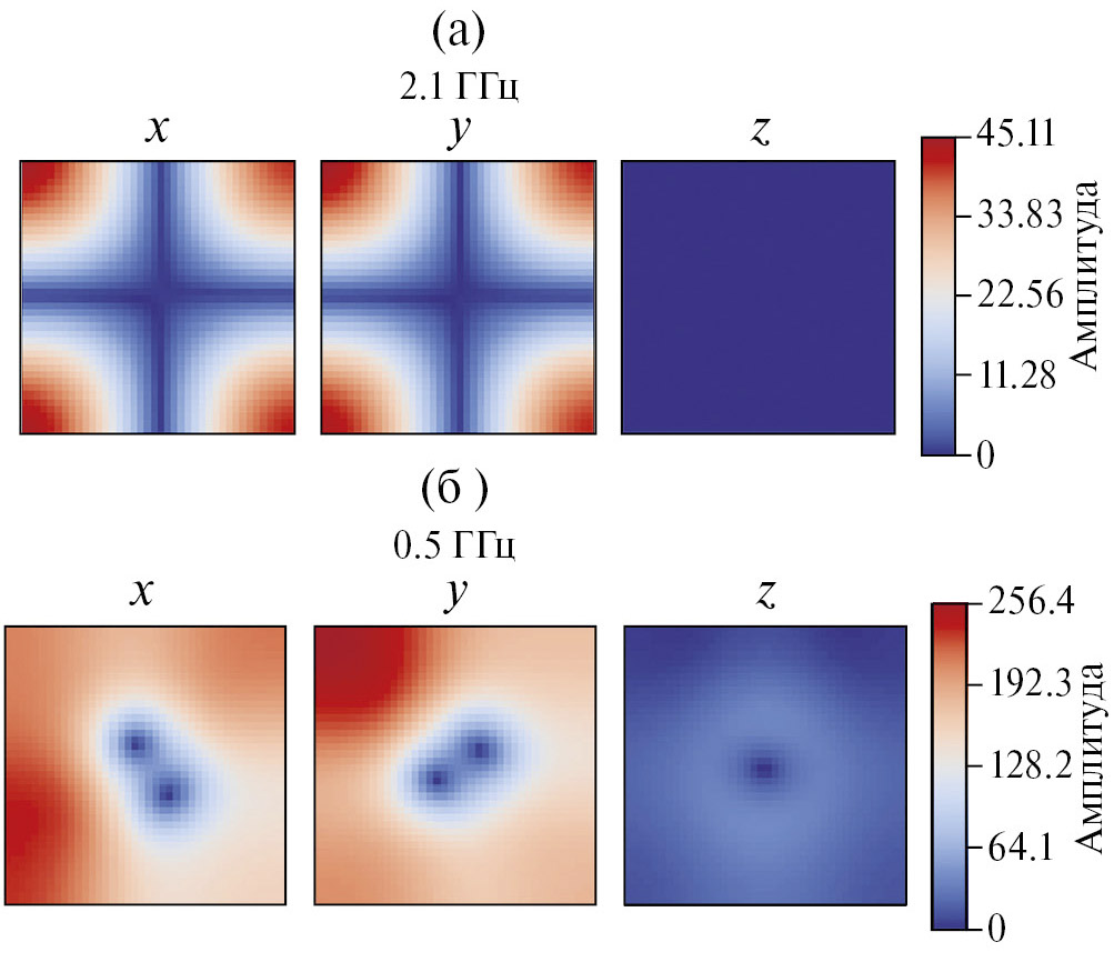 Вместе с тем возбуждение намагниченности, соответствующее высокочастотным модам, является неоднородным. Например, на рис. 3б отмечена мода с частотой 2.1 ГГц. Распределение амплитуды колебания показывает, что это так называемая угловая мода. Когда напряженность внешнего поля приближается к нулевому значению, вихревое распределение намагниченности охватывает оба слоя образца, за исключением небольшого участка в центре, образованного намагниченностью, направленной нормально по отношению к плоскости пленки. При такой напряженности внешнего поля остаются только неоднородные моды ФМР (рис. 3г) – моды более низких порядков. В отсутствие внешнего поля распределение возбуждения намагниченности для моды 0.15 ГГц максимально на границах пленки и отсутствует в ее центре (аналогично второй моде на рис. 2). Кроме того, появляется мода 0.5 ГГц, чье распределение амплитуды возбужденной намагниченности имеет вид, представленный на рис. 4б – оно напоминает распределение амплитуды для низкочастотной моды за исключением того, что в центре теперь обнаруживается два минимума сигнала намагниченности.