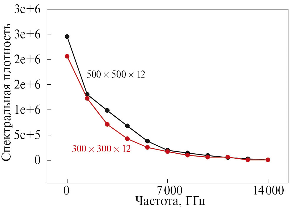 К пленке перпендикулярно ее плоскости прикладывали внешнее постоянное магнитное поле различной напряженности от насыщающего до нулевого значения. Затем система выводится из равновесного состояния путем бесконечно короткого импульсного возбуждения магнитного поля, что вызывает колебание намагниченности образца. Каждые 5 пикосекунд производилась запись на диск значений намагниченности всех ячеек. Всего было сделано N = 4000 таких записей, таким образом импульс спадал по закону уменьшающейся экспоненты 20000 пикосекунд. Для каждой i-й ячейки было произведено преобразование Фурье временного ряда игриковой компоненты намагниченности: