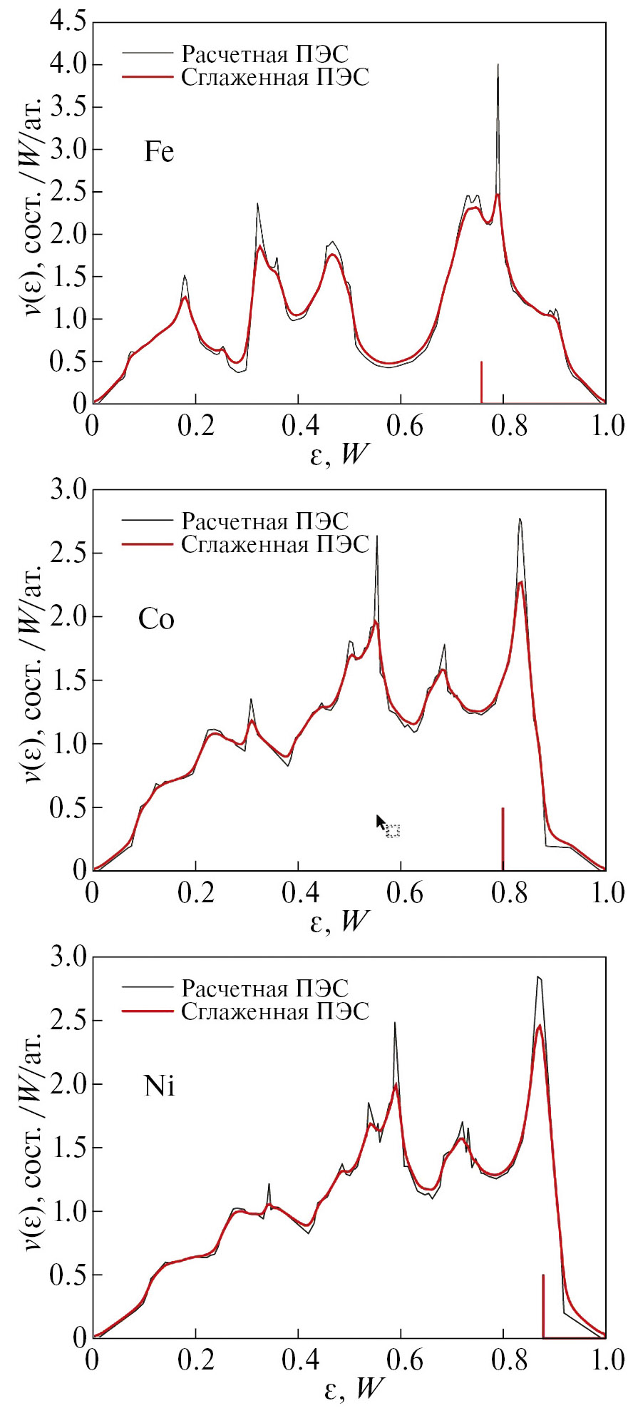Рис. 1. ПЭС d-электронов железа, кобальта и никеля: исходная и сглаженная с помощью свертки с функцией Лоренца полуширины Г = 0.005W. Энергии приведены в единицах ширины полосы (таблица 1). Вертикальной чертой обозначен уровень Ферми ɛF.