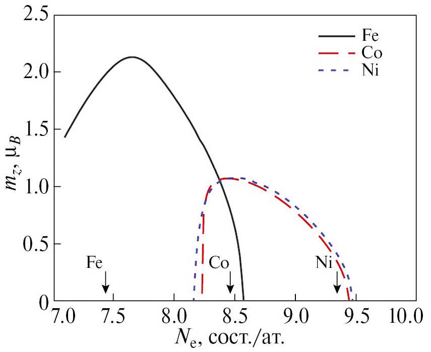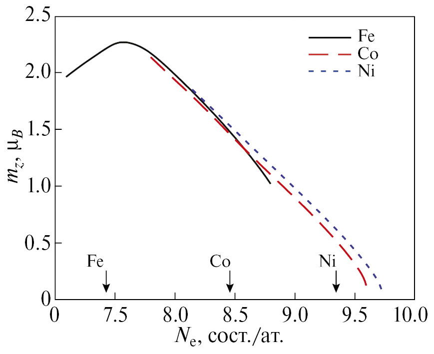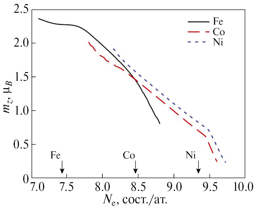 Рис. 5. Зависимость среднего магнитного момента mz для ПЭС железа, кобальта и никеля от числа d-электронов на атом в ДТСФ при T = 870 K (соответствует максимальной ТС для ГЦК-фазы сплавов Fe-Ni [25]). Стрелками обозначены значения Ne железа, кобальта и никеля.