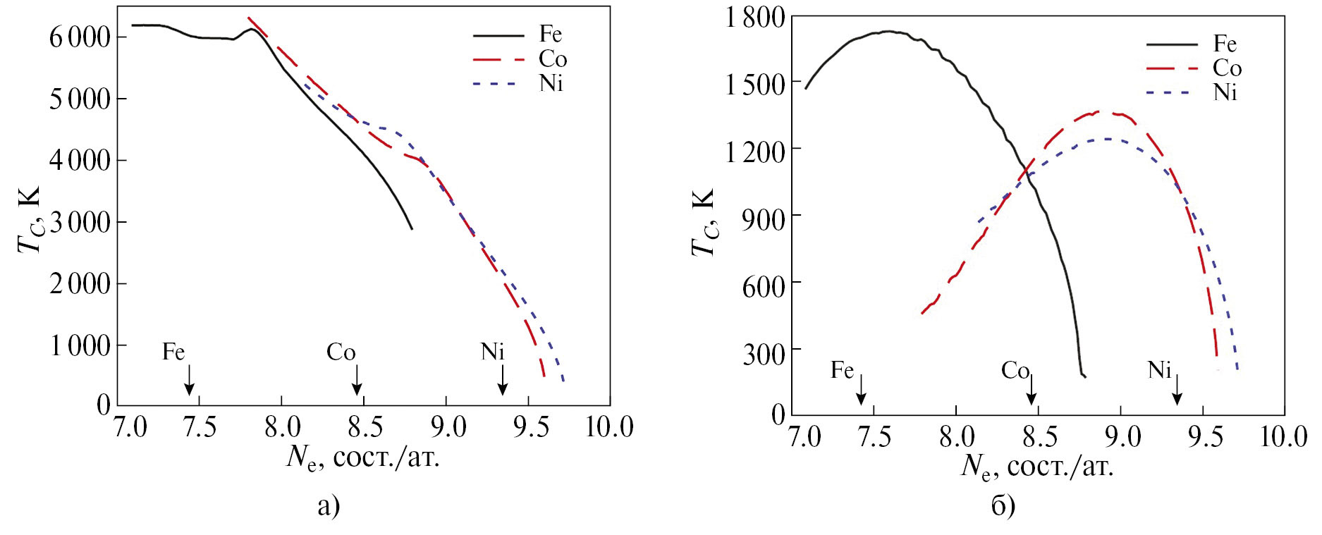 Рис. 4. Зависимость температуры Кюри TC от числа d-электронов на атом Nₑ для ПЭС железа, кобальта и никеля: а) в теории Стонера и б) в ДТСФ. Стрелками обозначены значения Ne железа, кобальта и никеля.