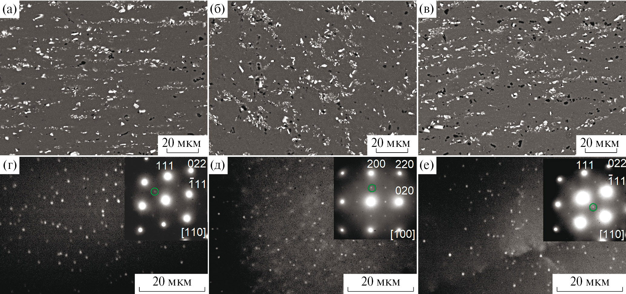 Рис. 3. Микроструктуры сплавов 1 (a, г), 2 (б, д) и 3 (в, е) после 6 циклов ВИК при 325 °C при анализе в (а–в) СЭМ и (г–е) ПЭМ; (г–е) – темнопольные изображения; окружностью на электронограммах (врезки) указаны рефлексы, в которых получены изображения (г–е).