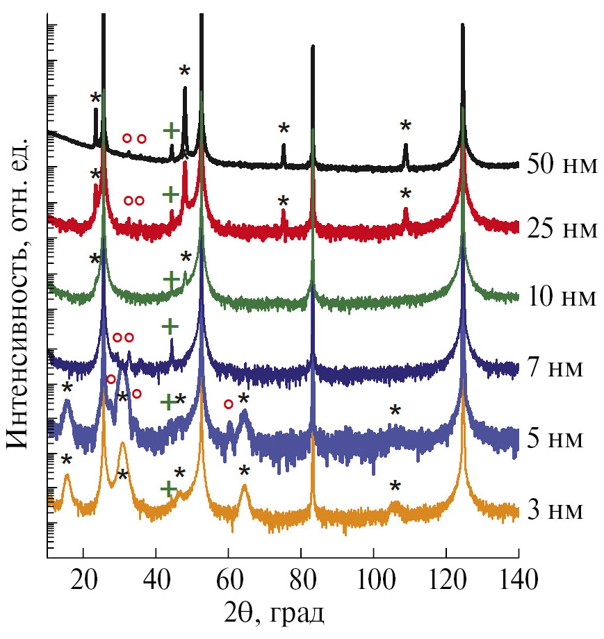Рис. 1. Кривые дифракционного отражения в режиме θ–2θ-сканирования тонких пленок различной толщины. Знаком * отмечены дифракционные пики от YFeO₃, ○ – Y₃Fe₅O₁₂, + – α-Fe₂O₃.