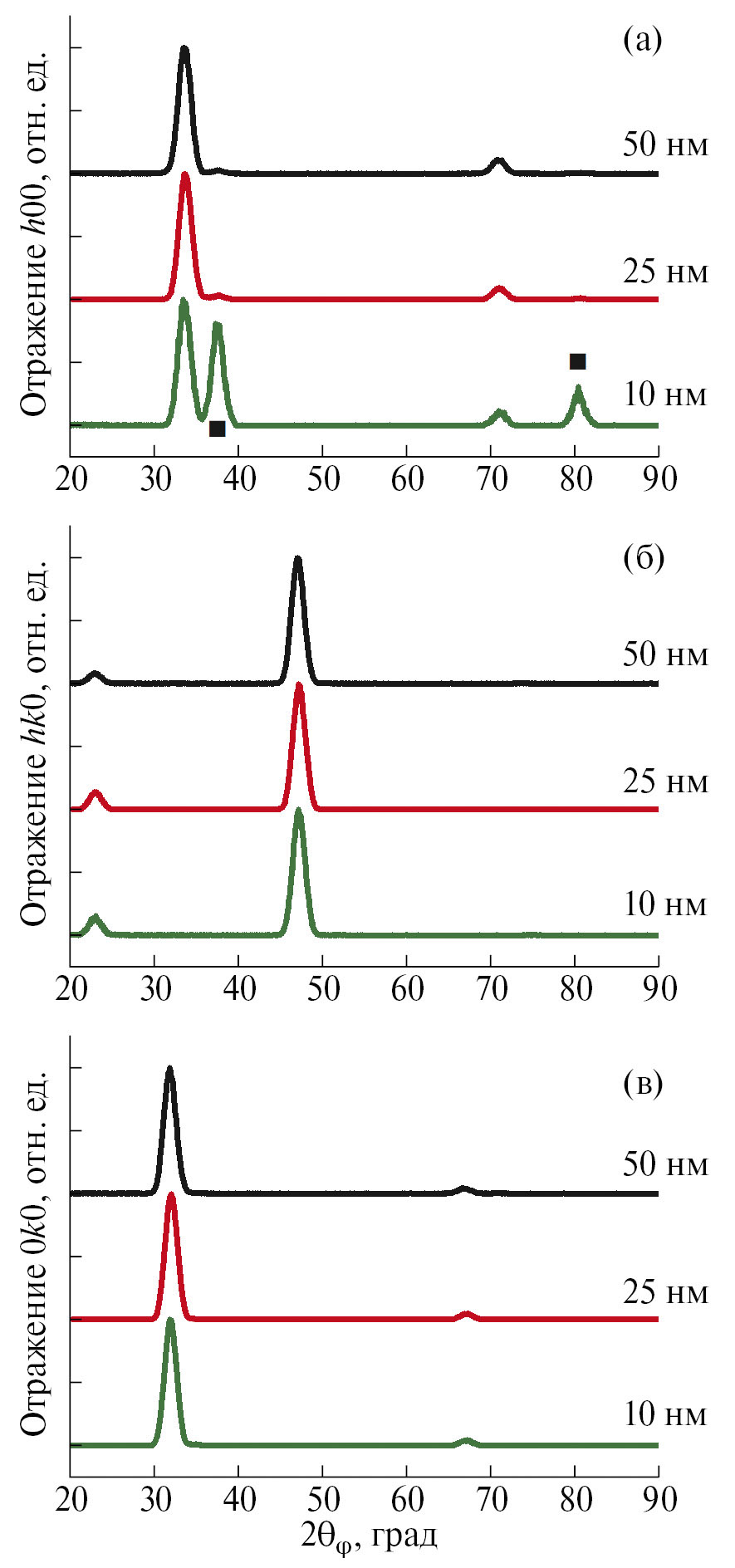 Измерения в геометрии in-plane (рис. 2) для образцов с толщиной пленки 10 нм, 25 нм и 50 нм подтвердили наличие текстуры . Наблюдаемые дифракционные пики 200 и 400 (рис. 2а), 110 и 220 (рис. 2б), а также 020 и 040 (рис. 2в) соответствуют отражениям от плоскостей (h00), (hk0) и (0k0), перпендикулярных к (001). Отметим, что на КДО для пленки толщиной 10 нм на рис. 2а справа от пиков 200 и 400 наблюдаются дифракционные пики 120 и 240 (отмечены знаком ■). Это может быть связано с тем, что пленка толщиной 10 нм еще недостаточно текстурирована, и существуют кристаллиты, ориентированные в другом направлении. Однако плоскости типа (120) также перпендикулярны к (001), что косвенно подтверждает вывод о наличии текстуры ⟨001⟩.