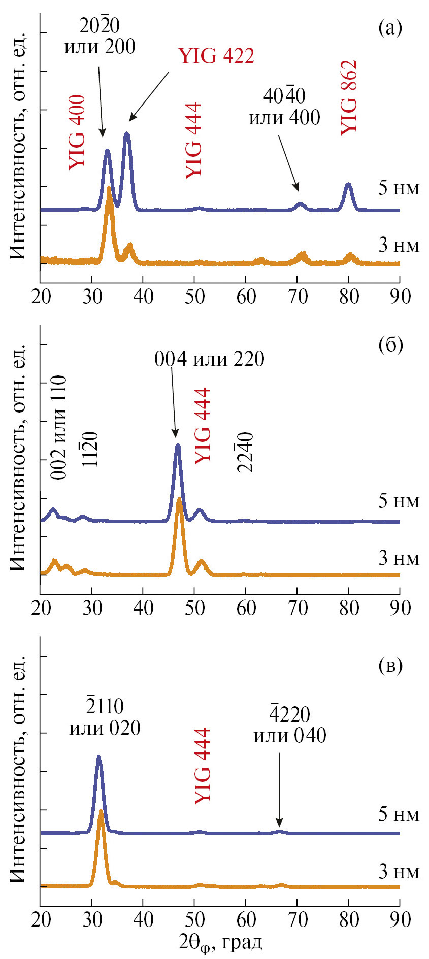 На полученных КДО наблюдаются пики, соответствующие отражениям (), , , (), и от плоскостей, перпендикулярных к плоскости (0001) h-YFeO₃, которые по своему угловому положению близки к отражениям 200, 200, 002 и 004 от плоскостей, перпендикулярных к (010) o-YFeO₃. В то же время несколько дифракционных пиков могут быть идентифицированы как отражения 020, 040, 110 и 220 от плоскостей, перпендикулярных к плоскости (001). При этом, как отмечено выше, были зарегистрированы отражения 200 и 400 от плоскостей (100), которые перпендикулярны как плоскостям (010), так и плоскостям (001) o-YFeO₃. Дифракционная картина в геометрии in-plane для пленки 3 нм (рис. 3) аналогична картине, наблюдаемой для пленки 5 нм. Отметим, что в скользящей геометрии удалось зарегистрировать отражения от нанокристаллитов YIG. Однако их интенсивность была значительно меньше, чем для 5 нм пленки. Это может также указывать как на небольшие размеры кристаллитов, так и на их малое количество. Вероятно, в пленках YFO толщиной 3 и 5 нм формируется три типа кристаллитов: кристаллиты o-YFeO₃ с преобладающей ориентацией (010), кристаллиты o-YFeO₃, ориентированные по (001), и кристаллиты h-YFeO₃ с ориентацией (0001).