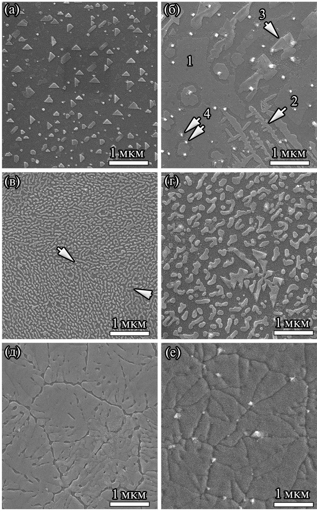 Рис. 4. РЭМ-изображения поверхности образцов с толщиной слоя YFeO₃ по данным оптической профилометрии: а – 3 нм; б – 5 нм (“1” – протяженные плоские частицы YFO, “2” – дендриты, “3” – ограненные частицы, “4” – относительно маленькие частицы с ярким контрастом); в – 7 нм (стрелками указана граница между разориентированными частицами), г – 10 нм, д – 25 нм, е – 50 нм.