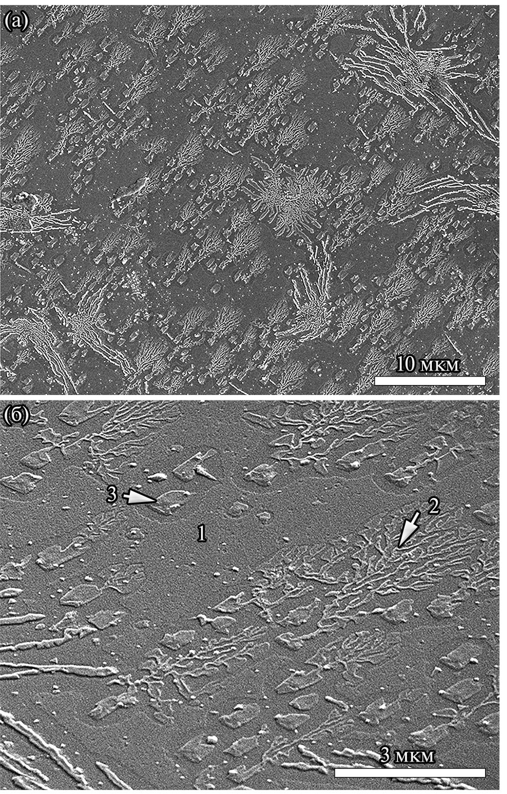 Более подробные исследования методом РЭМ, результаты которых представлены на рис. 5, выявили размеры частиц с дендритной морфологией (до 20 мкм) и более явно показали присутствие частиц третьего типа (“3” на рис. 4б и 5б) с прямоугольной огранкой у части из них и более развитой поверхностью, чем у частиц типа “1”. К сожалению, малая толщина частиц не позволила определить разницу в составе частиц различного типа методом энергодисперсионного рентгеновского микроанализа (ЭРМ) в РЭМ.