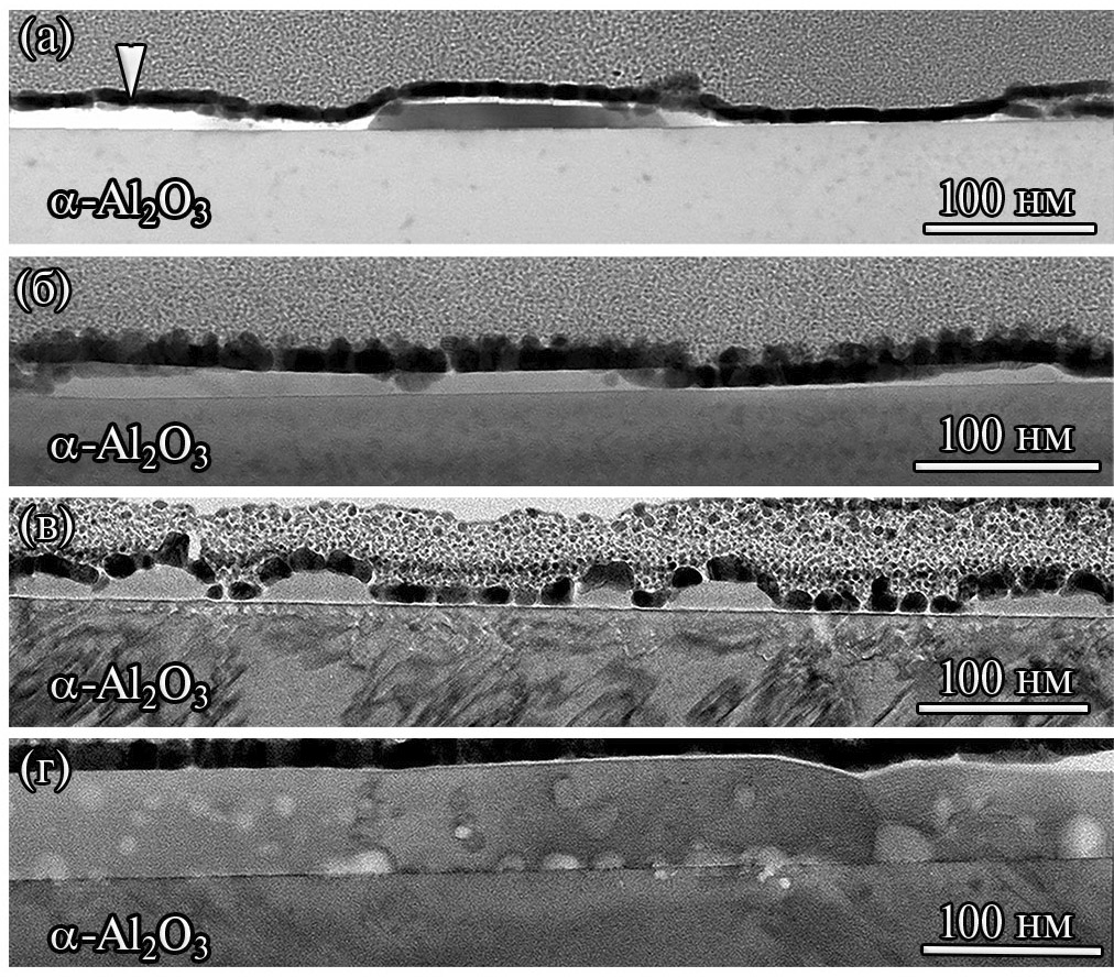 На ПЭМ-изображении наблюдаются поры округлой формы. Для более детального исследования были получены темнопольные ПРЭМ-изображения с регистрацией электронов, рассеянных на большие углы (рис. 15г). Поры, для которых характерен более темный контраст, сформированы как на границе раздела пленка / подложка, так и в объеме пленки, количество пор уменьшается с приближением к поверхности. Слой вблизи поверхности практически не содержит пор. На границе с подложкой поры имеют форму полусфер.