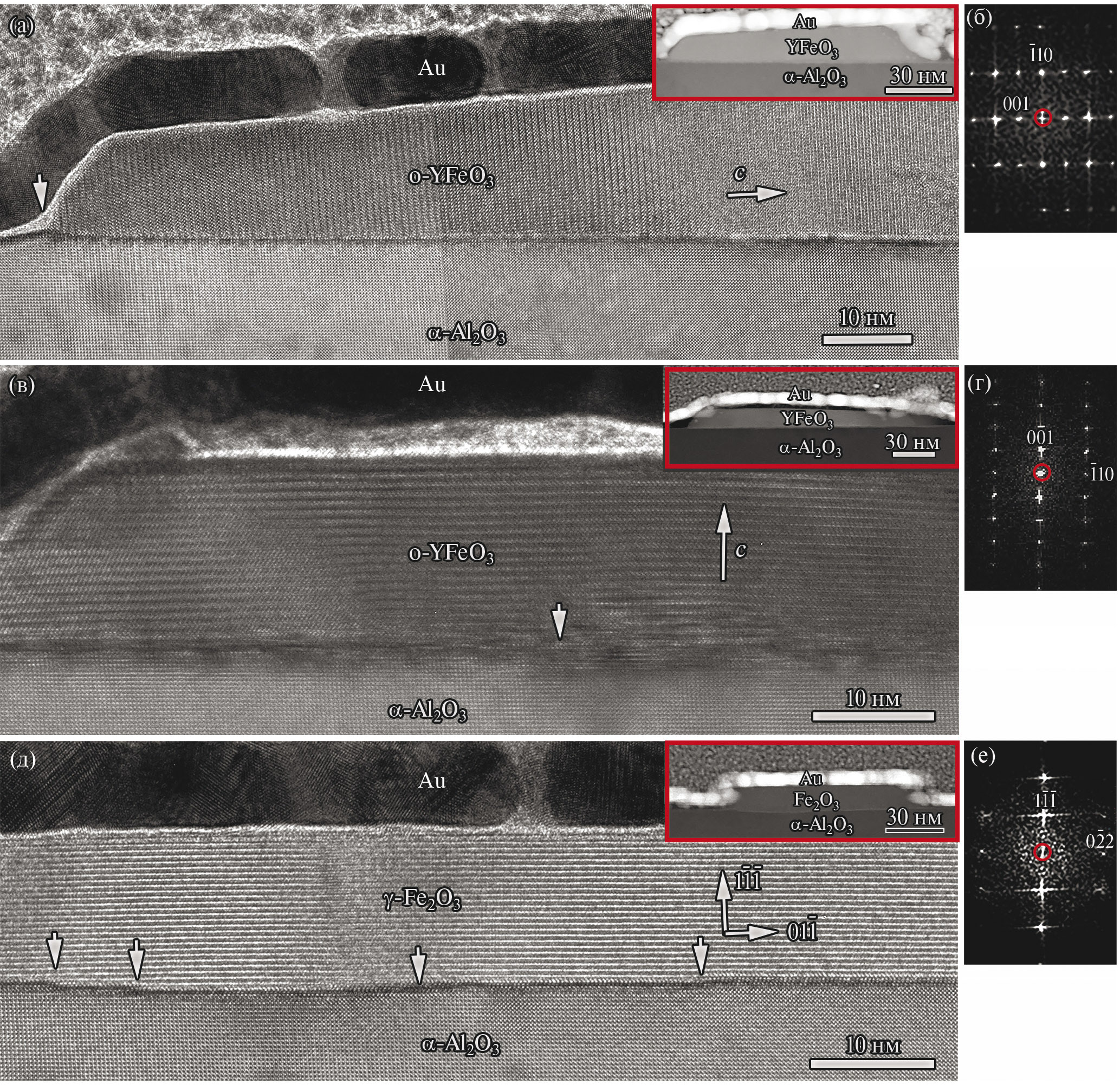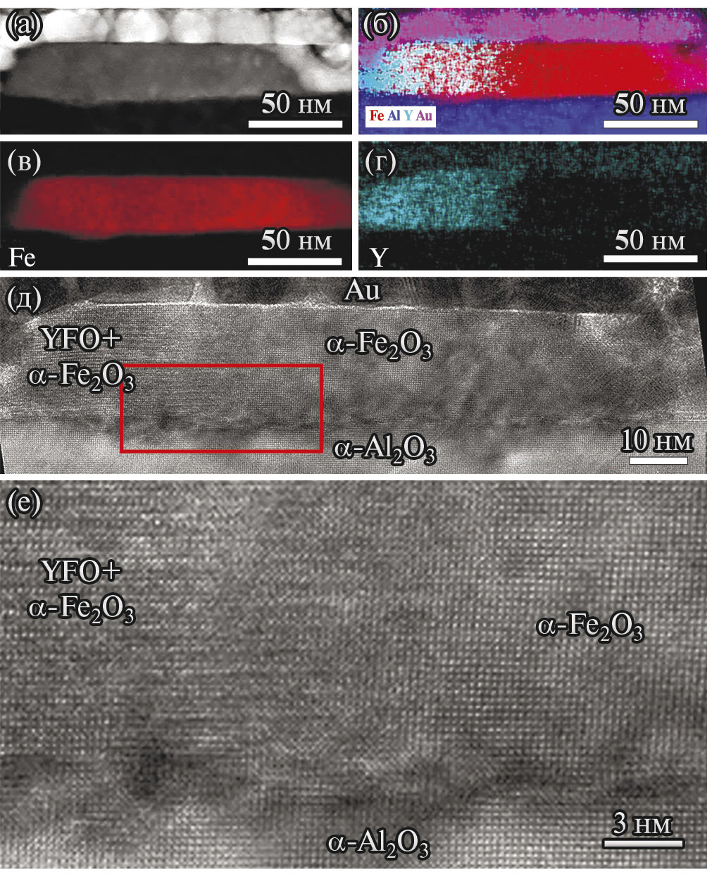 Элементное ЭРМ-картирование и ВР ПЭМ отдельных островков показали, что в пленке формируются островки оксидов железа α-Fe₂O₃, и пример представлен на рис. 14. Островок состоит из двух кристаллитов – α-Fe₂O₃ и кристаллической фазы YFO. Распределение всех элементов показано на рис. 14б, отдельно Fe и Y на рис. 14в и рис. 14г, соответственно. На рис. 14д представлено ВР ПЭМ-изображение островка, его увеличенная часть (выделена прямоугольником) на рис. 14е. Определены параметры α-Fe₂O₃ (для гексагонального описания): а = 5.0 Å, c = 13.7 Å, α = 90°. Ориентация кристаллита α-Fe₂O₃ соответствует ориентации монокристалла сапфировой подложки. Рассогласование между межплоскостными расстояниями α-Fe₂O₃ и α-Al₂O₃ составляет ~ 5.6%. Определить кристаллическую иттрий содержащую фазу не удалось из-за наложения на нее кристаллита α-Fe₂O₃.
