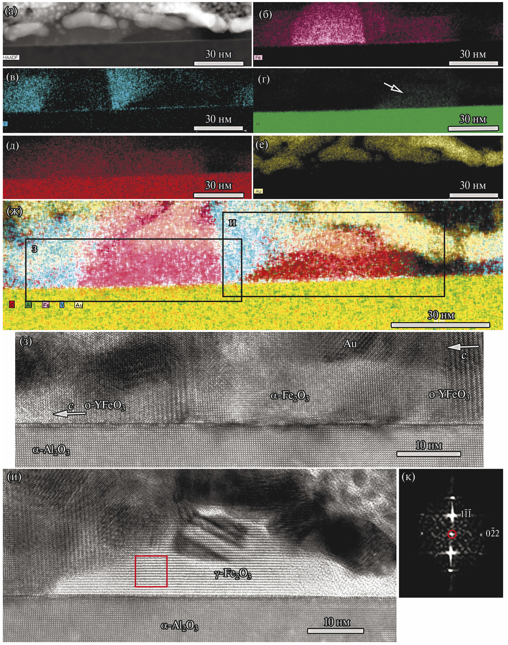 Результаты исследования группы островков меньшего размера без огранки методом ПРЭМ с регистрацией электронов, рассеянных на большие углы, и ЭРМ представлено на рис. 8. Оказалось, что группа островков состоит из ортоферритов иттрия и оксидов железа. Частицы о-YFeO₃ ориентированы осью с параллельно поверхности подложки (рис. 8з), структура одного из островков оксида железа на этом же изображении соответствует гематиту α-Fe₂O₃ с ориентацией, полностью совпадающей с ориентацией сапфировой подложки. Неожиданно оказалось, что кристаллическая структура островка оксида железа, расположенного рядом (ВР ПЭМ-изображение которого представлено на рис. 8и), соответствует γ-Fe₂O₃. Необходимо отметить, что на карте распределения Al в области этого островка наблюдается слабый контраст (указан стрелкой на рис. 8г), свидетельствующий о присутствии Al в материале островка.